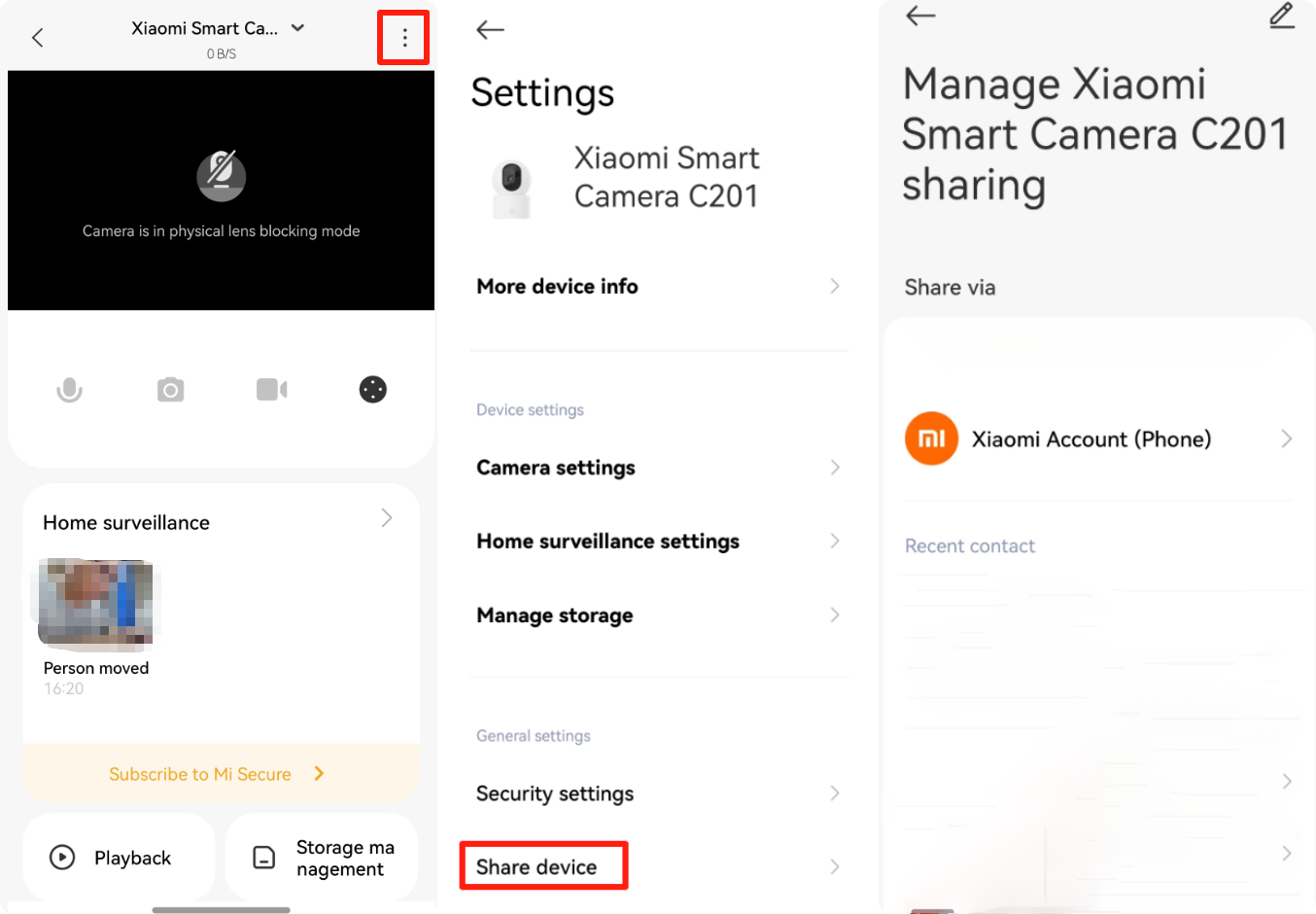 A: To set Physical lens blocking on the Xiaomi Smart Camera C201, please refer to the following methods: