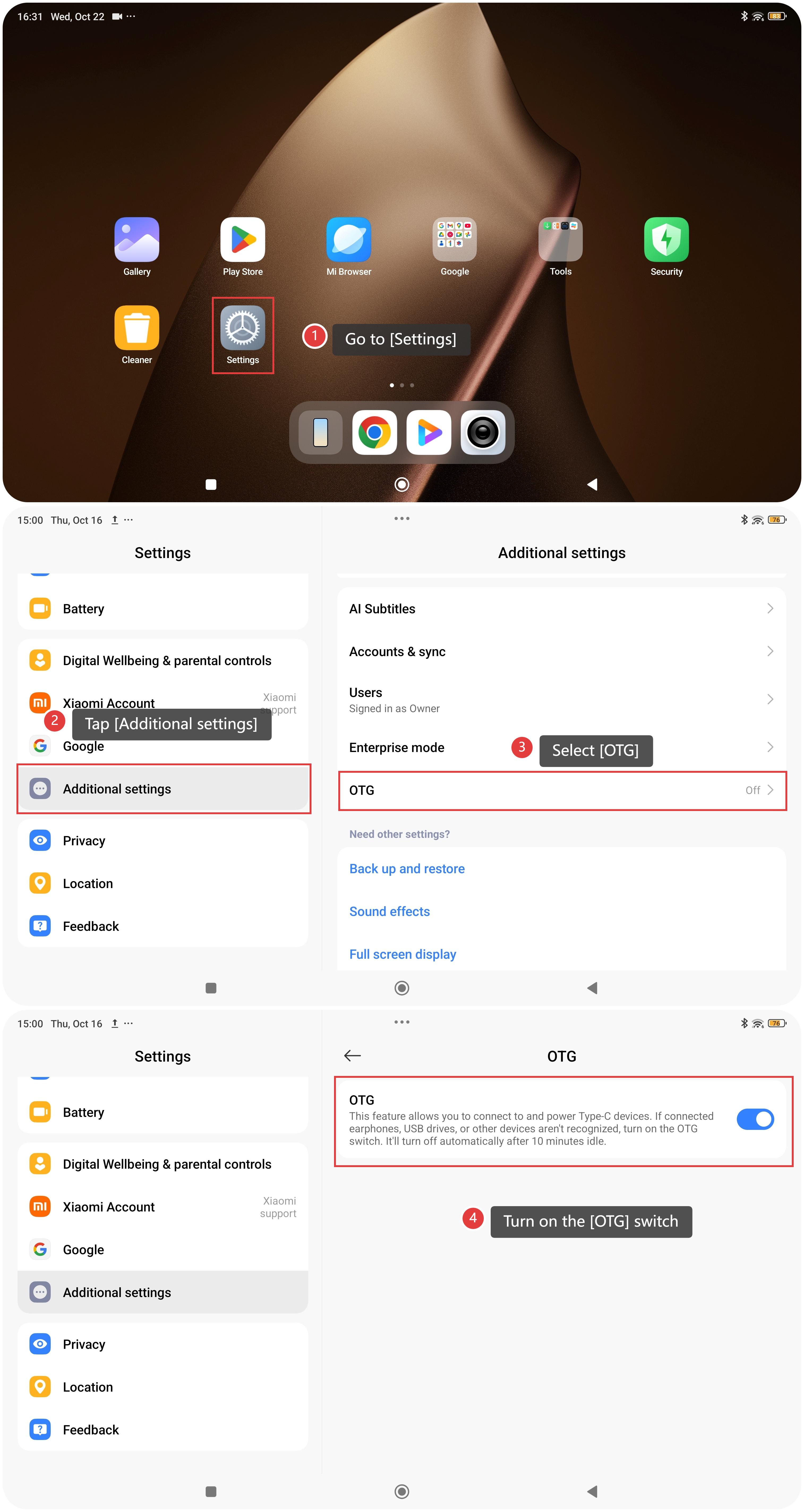 The OTG (On-The-Go) feature on the Xiaomi Pad Mini allows you to connect to and power Type-C devices. If connected earphones, USB drives, or other devices are not recognized, turn on the OTG switch.