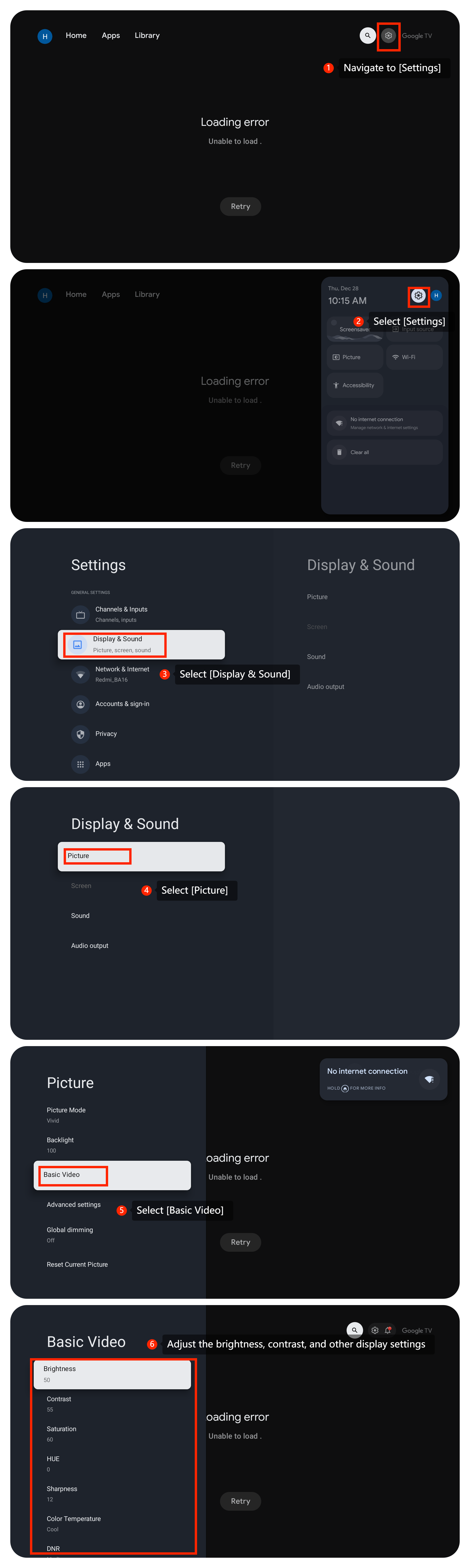 4. Navigate to [Settings] >> [Display & Sound] >> [Picture] >> [Basic Video] >> check for the brightness, contrast, and other display settings;