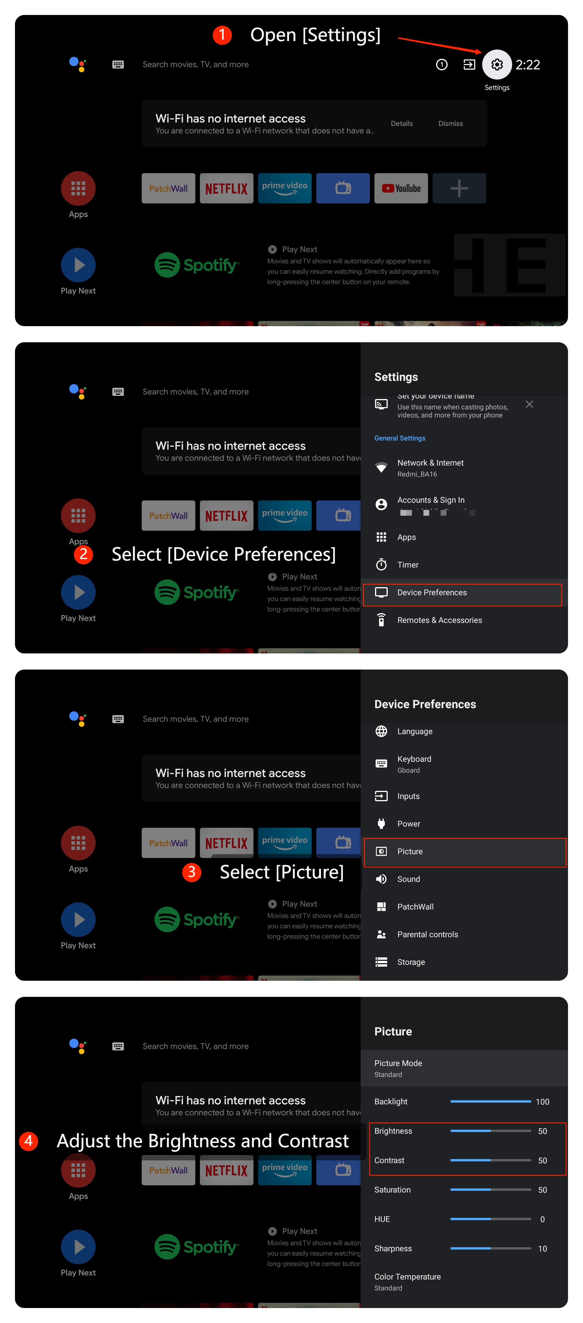 Scenario 3: If the issue occurs while you are using apps on your TV, please refer to the following methods: 1. Ensurethe app’s settings are configured to match the screen size and resolution of your TV as some apps have their own display settings; 2. Ensure that the app you are using has enough storage by opening [Settings] >> [Apps] >> [Clear cache] or [Clear data]; 3. Install any available updates and see if that resolves the issue. Please navigate to [Apps] >> select Play Store>> select the icon at the upper right corner >> [Manage apps & games] >> [Updates] >>[Check for updates]; 4. You can uninstall the app and reinstall it from the Play Store; Note: Uninstalling and reinstalling may affect the data. Please save or back up the data in advance. 5. Check the TV settings related to the picture by going to [Settings] >> [Device Preferences] >> [Picture] >> adjust related features; 6. Turn off your TV, unplug it from the power source, wait for a minute, and then plug it back in. Power on the TV and check if the issue persists; 7. Ensure that your TV’s firmware is up to dateby navigating to [Settings] >>[Device Preferences] >>[About] >>[System update]; 8. If all else fails, please reset your TV to the factory defaults by going to [Settings] >> [Device Preferences] >>[Reset]. Note: Keep in mind that this will erase all settings and data on your TV. So be cautious before proceeding. If the above troubleshooting methods can’t resolve the issue, please contact our local official service center or your seller for further assistance. They will help you in this regard.
