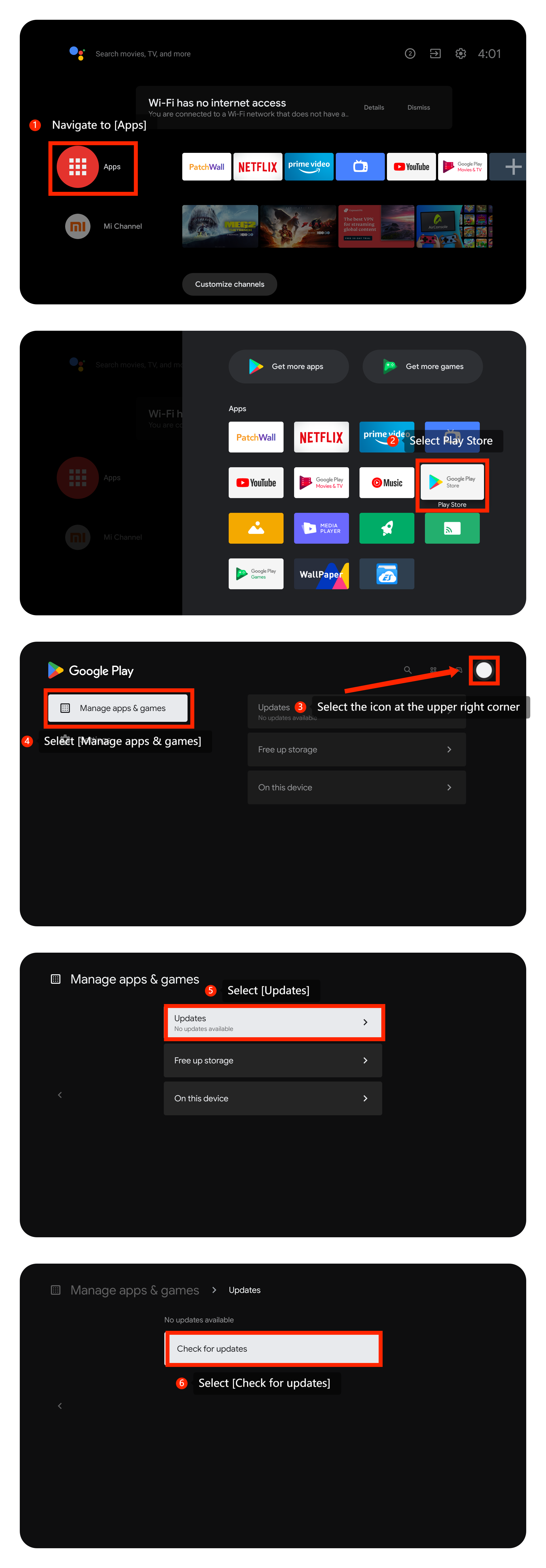 Scenario 3: If the issue occurs while you are using apps on your TV, please refer to the following methods: 1. Ensurethe app’s settings are configured to match the screen size and resolution of your TV as some apps have their own display settings; 2. Ensure that the app you are using has enough storage by opening [Settings] >> [Apps] >> [Clear cache] or [Clear data]; 3. Install any available updates and see if that resolves the issue. Please navigate to [Apps] >> select Play Store>> select the icon at the upper right corner >> [Manage apps & games] >> [Updates] >>[Check for updates];