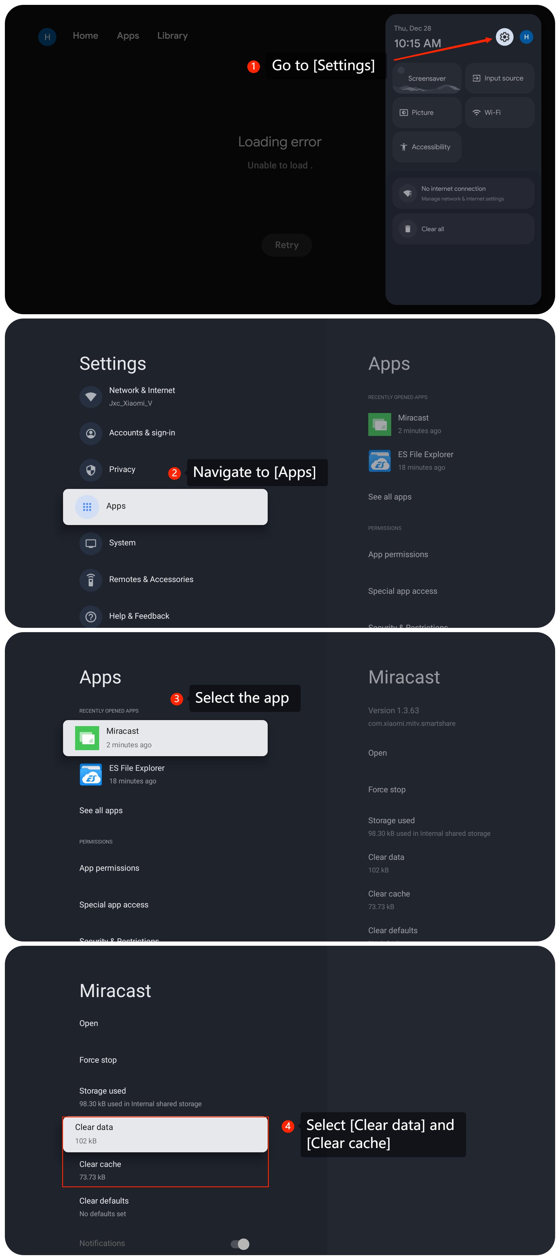 1. Clear the cache or data of the app by navigating to [Settings] >> [Apps] >> select the specific app >> [Clear cache] and [Clear data];