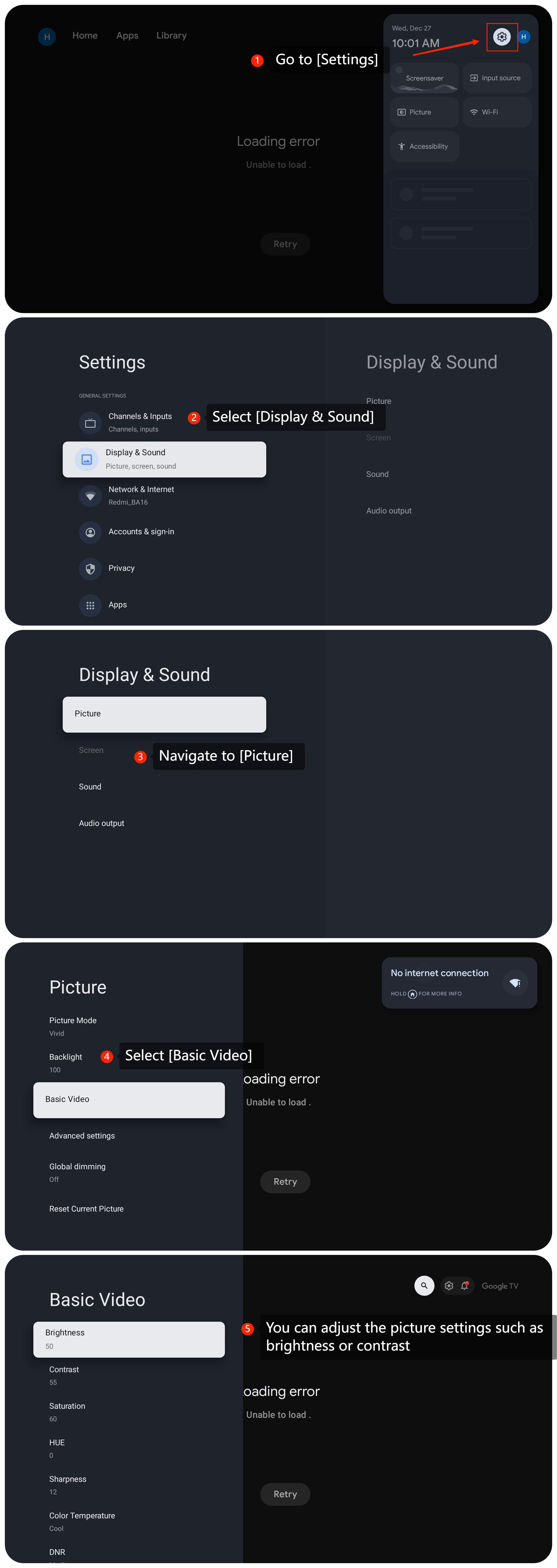 4. You can also make corresponding picture settings. Go to [Settings] >> [Display & Sound] >> [Picture] >> [Basic Video] >> adjust [Brightness] or [Contrast];