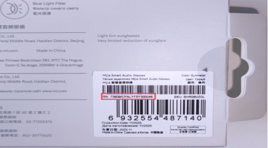 1. The SN on the Mijia Smart Audio Glasses is located on the back of the packaging box.
