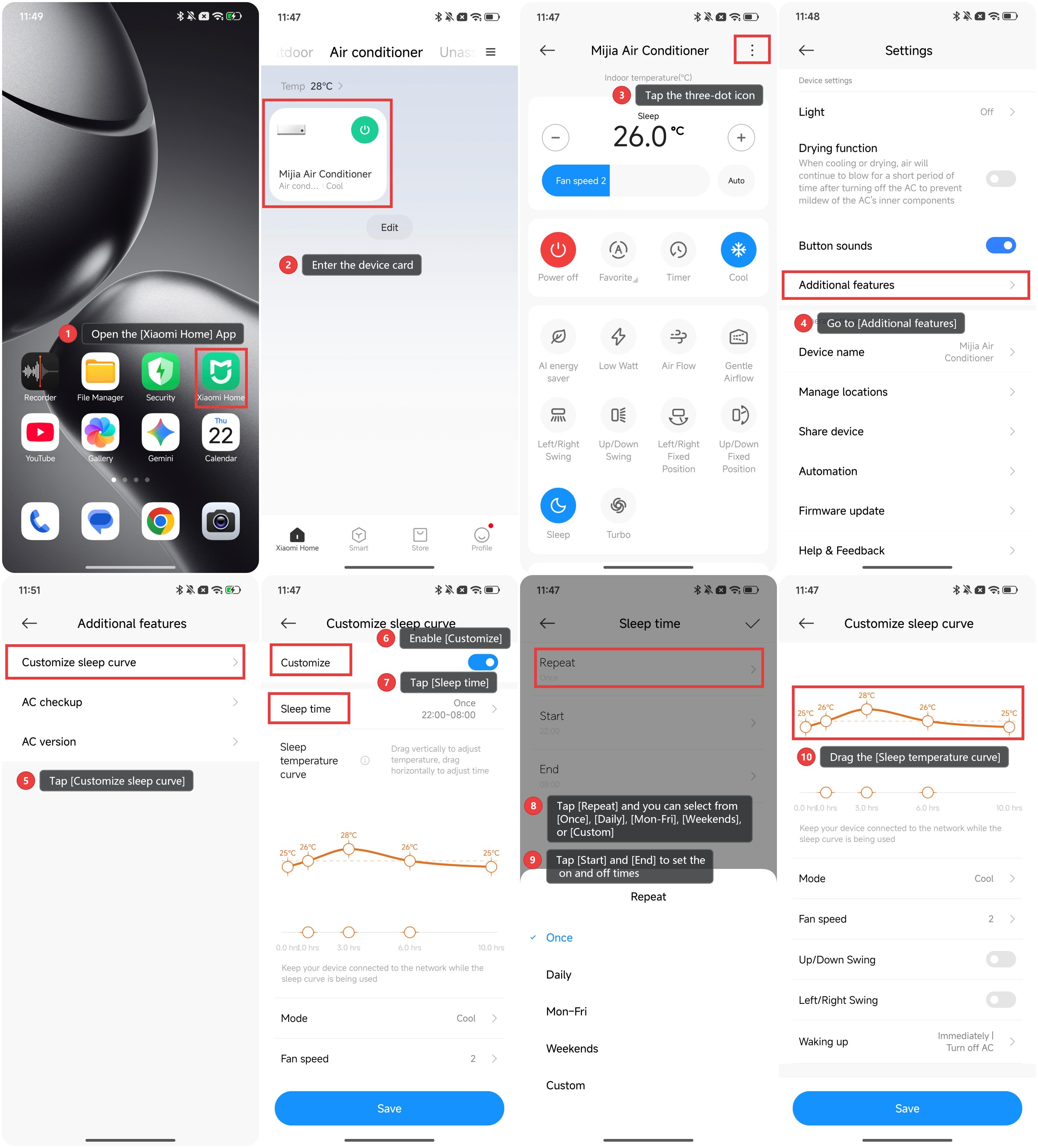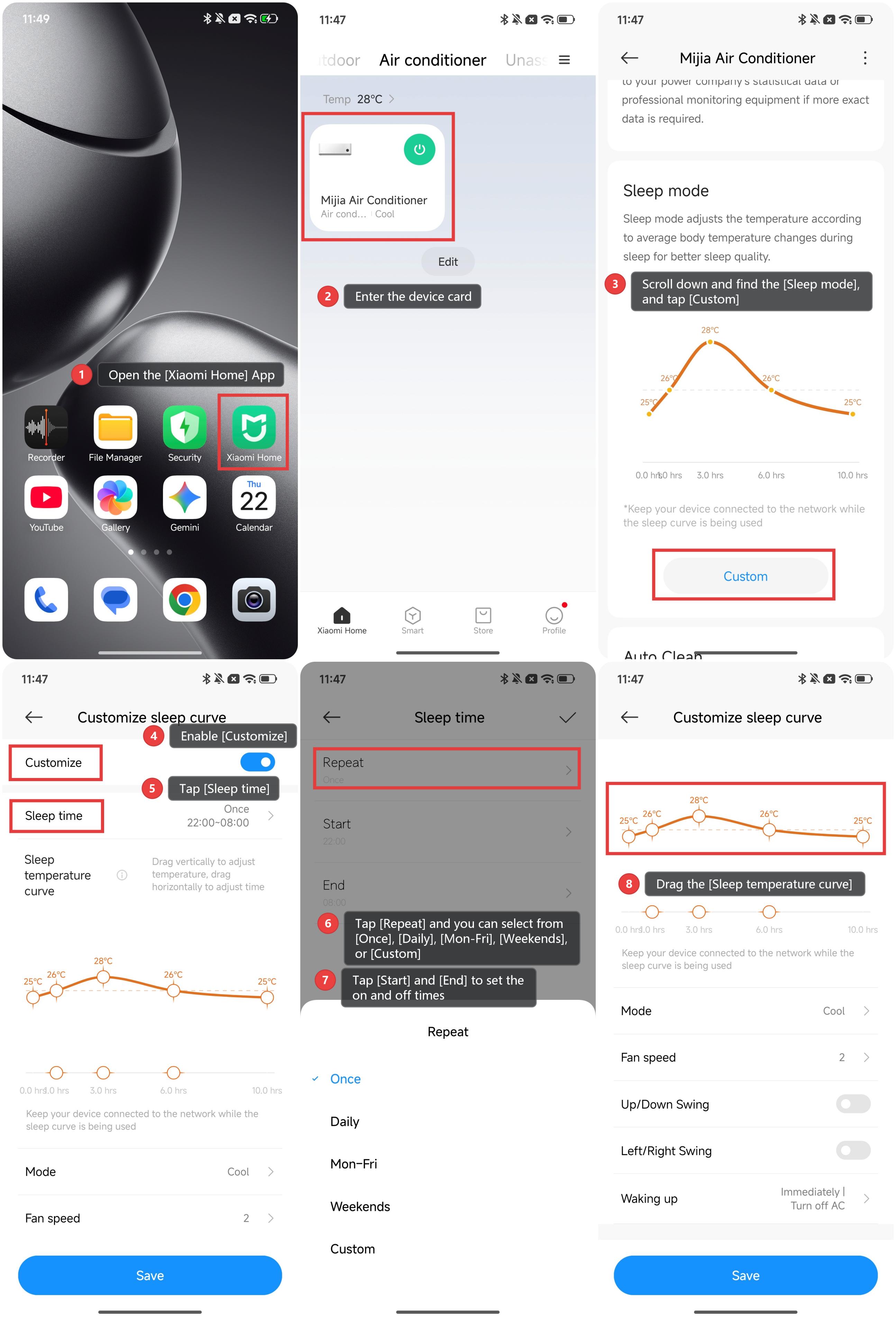 To customize the sleep mode of the Mijia Air Conditioner, please refer to the following methods: