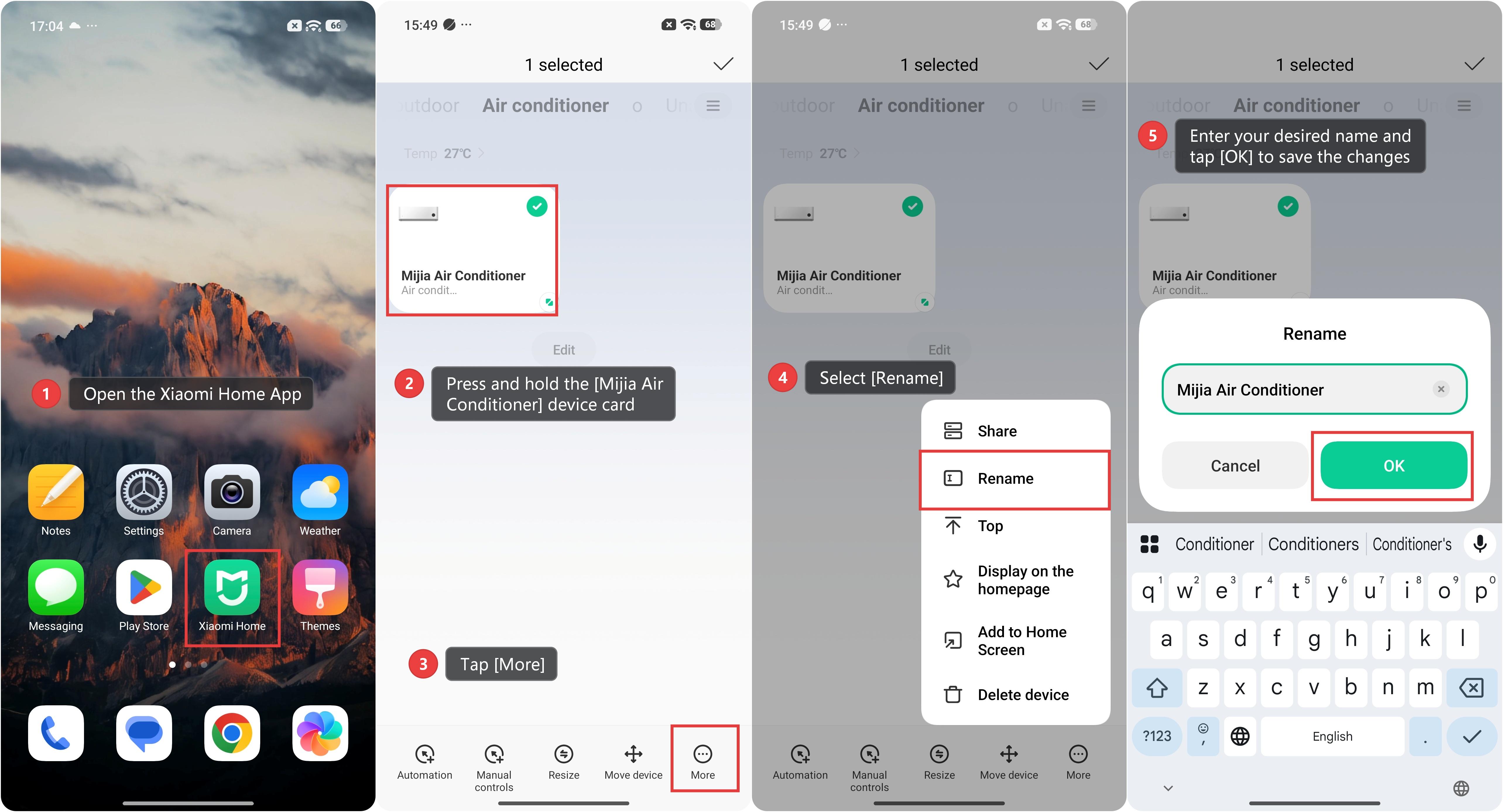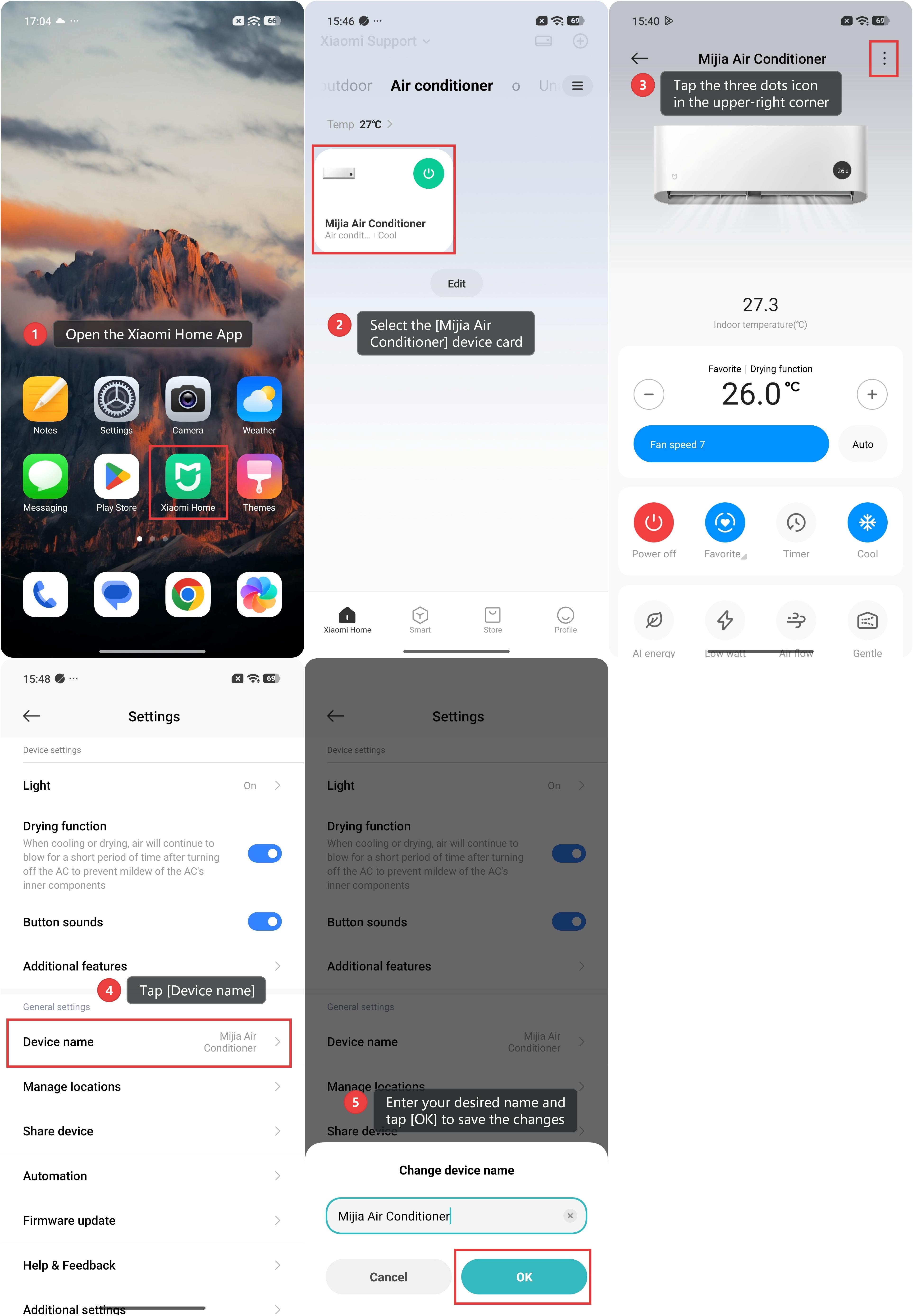 To rename the Mijia Air Conditioner in the Xiaomi Home App, please refer to the following methods: