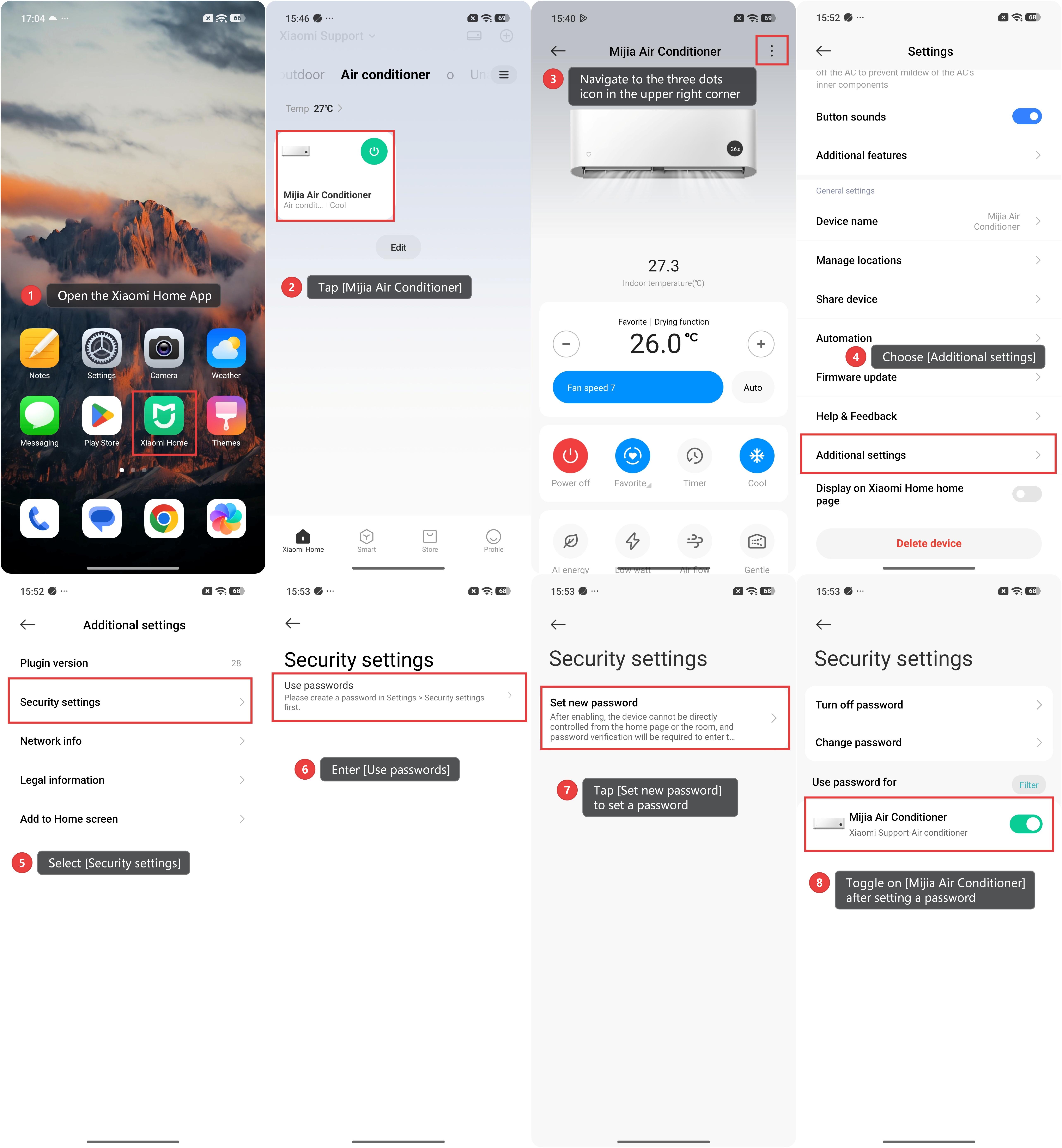 To set a password for the Mijia Air Conditioner in the Xiaomi Home App, please refer to the following methods:
