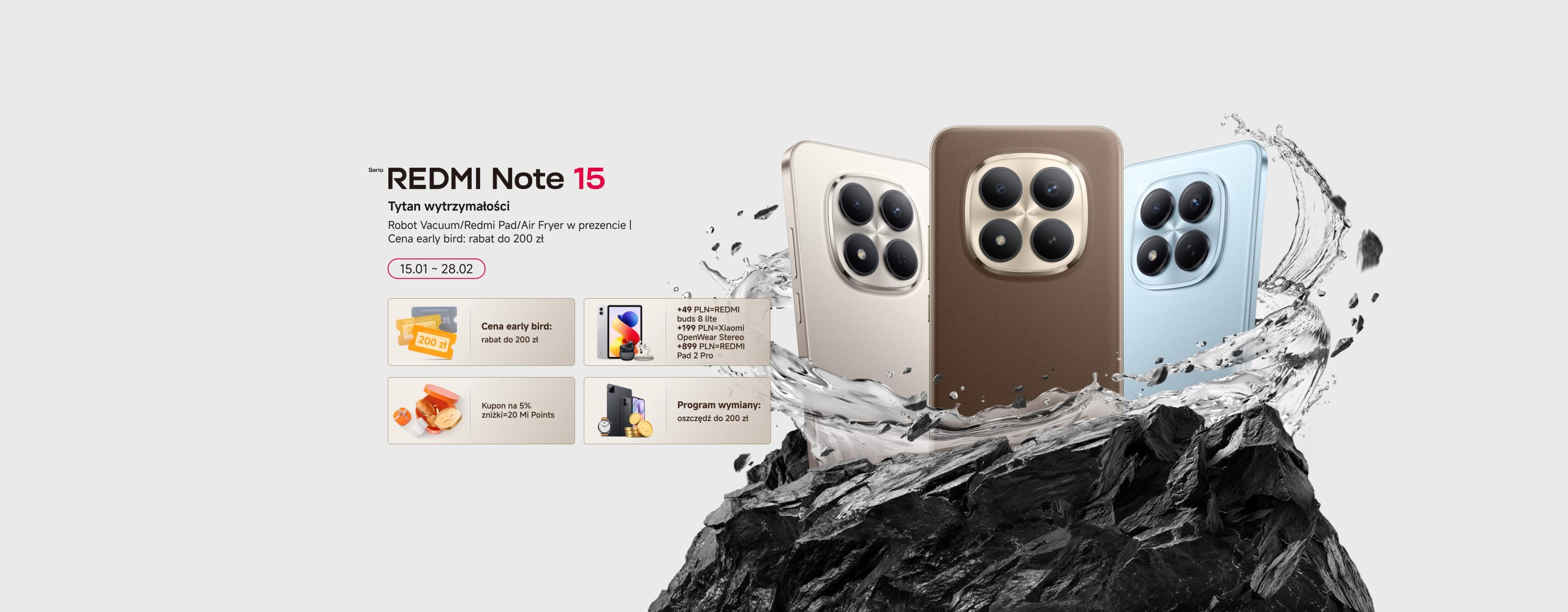 15.01 19:00 - 28.02 23:59 Wysyłka części bonusów do zakupów na mi.com rozpocznie się po 20 lutego – bez dodatkowej rejestracji i czynności.Robot Vacuum S40C EU / Redmi Pad 2 4GB+128GB w prezencie!