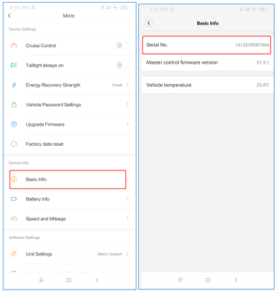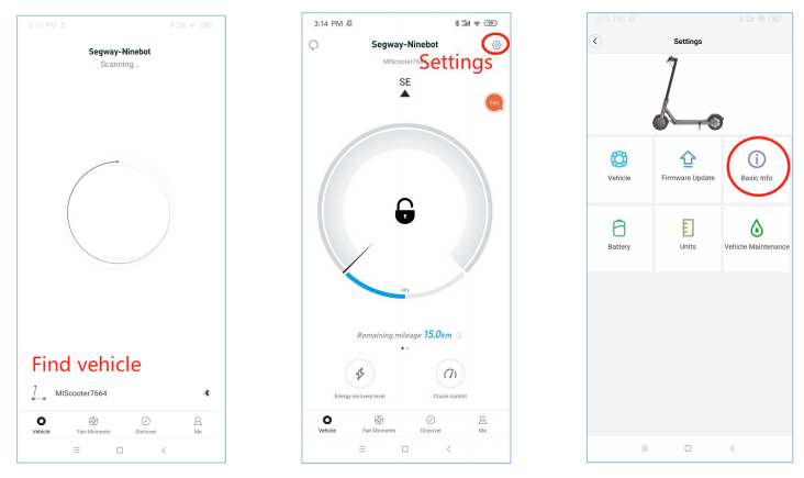 odczytanie numeru seryjnego i włączenie MiScootera; Kliknij Skanuj w poszukiwaniu pojazdu → Ekran główny → Ustawienia (prawa górna ikona) → Informacje podstawowe ,, aby wyświetlić numer seryjny.