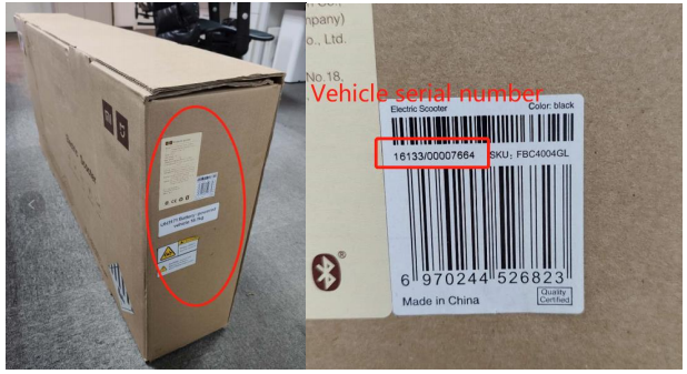- Jeśli MiScooter nie jest rozpakowany i nowy , możesz uzyskać informacje o numerze seryjnym z opakowania zewnętrznego (patrz zdjęcie poniżej)