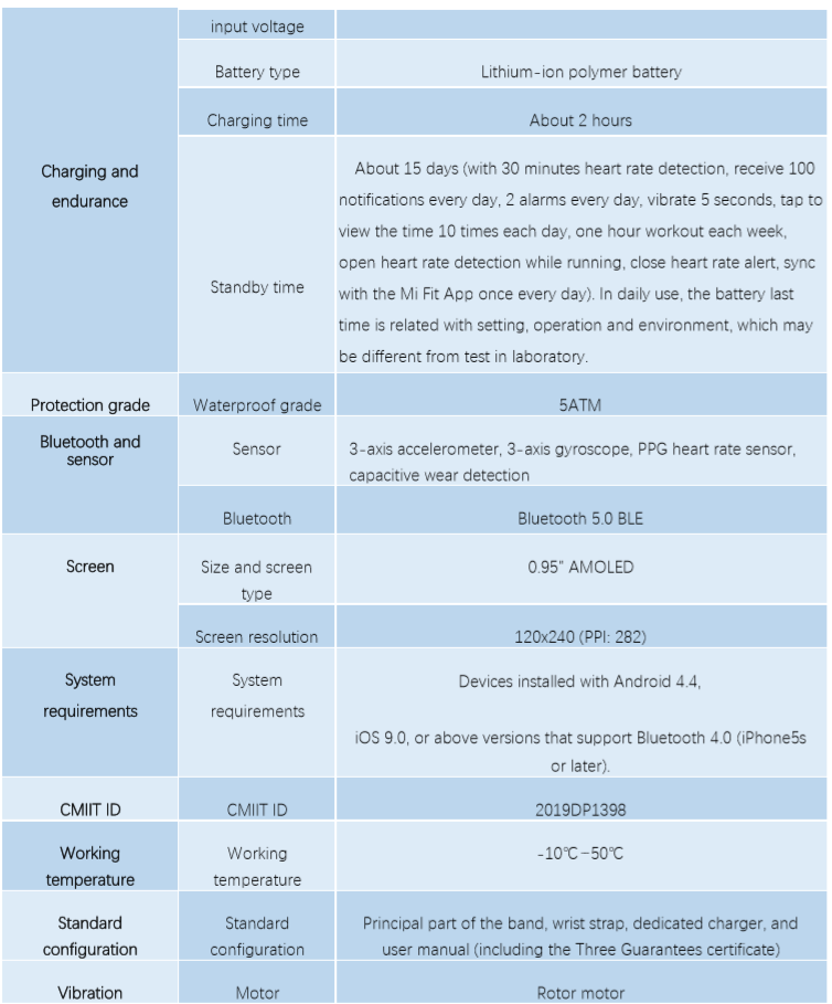 Specyfikacje Mi Band Czy Mi Band 4 szkodzi ludzkiemu organizmowi? Mi Band 4 stosuje Bluetooth Low Energy 5.0. Jego promieniowanie jest znacznie niższe niż w przypadku Bluetoothzestaw słuchawkowy, a jego siła sygnału jest mniejsza niż jedna tysięczna mocy telefonu komórkowego. Po więcej Po ponad dziesięciu latach badań i ankiet Światowa Organizacja Zdrowia stwierdza, że sygnały Bluetoothnie wyrządzi żadnej szkody ludzkiemu ciału. Dlatego możesz być pewien, że użyjesz tego zespołu. Jaka jest standardowa konfiguracja dla Mi Band 4 i jakiego koloru jest nadgarstekpasek? Standardowy Mi Band 4 zawiera główną część opaski, pasek na nadgarstek, ładowarkę i instrukcję obsługi (w tym certyfikat Trzech Gwarancji). Kolor paska na nadgarstek zależy od koloru sprzedawanego. Jak obsługiwać ekran i przyciski Mi Band 4? Metoda działania: przesuń w górę iw dół, aby przełączać się między funkcjami (wyświetlanie pasma, stan, tętno, trening, pogoda, powiadomienia, więcej), dotknij przycisku funkcji, aby przejść do interfejsu funkcji, i przesuń w prawo, aby wyjść z interfejsu funkcji; dotknij przycisku dotykowego, aby powrócić. Czy można zmienić styl wyświetlania opaski Mi Band 4? TAk. W interfejsie wyświetlania zespołu Mi Smart Band 4. Przesuń w dół, aby wejść do Więcej - Zespół wyświetlacz, a następnie wybierz ulubiony styl wyświetlania opaski lub dotknij aplikacji Mi Fit - Profil - Mi Smart Band 4 - Ustawienie wyświetlania opaski, aby pobrać niestandardowy wyświetlacz opaski. Czym jest „ekran zastępczy treningu” i jak działa? Po sparowaniu Mi Band 4 z aplikacją Mi Fit, jeśli którykolwiek z trybów, takich jak bieganie na zewnątrz, Bieżnia, jazda na rowerze i spacery są włączone w trybie treningu i wystarczy podnieść nadgarstek, aby wyświetlić wszystkie kluczowe dane na opasce (takie jak czas treningu, przebieg, tempo, tętno, tętno) strefa, średnie tempo, aktualny czas itp.) podczas treningów. Czy pasek na nadgarstek Mi Band 4 jest kompatybilny z paskami innych opasek? Pasek na nadgarstek Mi Band 4 jest kompatybilny z paskiem Mi Band 3, ale jest niezgodny z paskieminne zespoły, takie jak Mi Band 2, Mi Band 1S, Mi Band. Jak zainstalować i zdemontować pasek na nadgarstek Mi Band 4? Instalacja: Włóż jeden koniec modułu śledzącego do gniazda na pasku na nadgarstek. Mocno dociśnij drugi koniec, aby cała jednostka znalazła się w gnieździe i zabezpiecz ją. Demontaż: Zdejmij opaskę, mocno pociągnij za oba końce paska na nadgarstek, aby zrobić małą szczelinę między modułem śledzącym a szczeliną paska na nadgarstek, a następnie palcami zdejmij moduł z przedniej strony paska na nadgarstek. Co to jest wodoodporność do 50m (5ATM)? 50m wodoodporność odnosi się do wodoodporności opaski w standardowych warunkach. Taki warunki oznaczają, że opaska ma pewien stopień odporności na ciśnienie wody w stanie stacjonarnym. Wartość odporności na ciśnienie nie jest uzyskiwana pod wodą, lecz na podstawie przeliczenia ciśnienia atmosferycznego. Wartość wodoodporności 50m wskazuje, że opaska wytrzymuje nacisk 50 metrówpod wodą w stanie stacjonarnym. Czy mogę nosić Mi Band 4 do kąpieli lub pływania? Mi Band 4 ma wodoodporność 5ATM i można go nosić pod prysznicem, pływać w basenie i pływać w płytkich wodach. Jak naładować Mi Band 4? Do ładowania Mi Band 4 zaleca się użycie dedykowanej ładowarki (wyjmij moduł śledzący, włóż końcówkę z dwoma metalowymi stykami do dedykowanej ładowarki, jak pokazano poniżej). Po zainstalowaniu lokalizatora podłącz kabel ładujący do portu USB komputera lub ładowarki telefonu komórkowego o napięciu 5V i prądzie wyjściowym ponad 250mAh. Sama opaska ogranicza prąd wejściowy, więc nie musisz się martwić o jakiekolwiek uszkodzenia. Jak wyświetlić postęp ładowania Mi Band 4? Po włożeniu opaski do ładowarki zostanie wyświetlona ikona ładowania. W ten sposób można wyświetlić ogólny postęp ładowania, a nie określoną wartość procentową. Po około dziesięciu sekundach ekran zgaśnie. Jeśli właściciel chce zobaczyć postęp ładowania, musi dotknąć palcem przycisku dotykowego, a na ekranie pojawi się interfejs ładowania. Jaka jest pojemność baterii, czas ładowania i wytrzymałość Mi Band 4? Pojemność baterii Mi Band 4 to 135mAh, a czas ładowania to około 2 godziny. Proszę dotknij przycisk dotykowy, aby wyświetlić postęp ładowania. Opaska może wytrzymać około 15 dni, co przetestowano przy następującym zastosowaniu: z 30-minutowym wykrywaniem tętna, otrzymuj 100 powiadomień dziennie, 2 alarmy dziennie, wibruj 5 sekund, dotknij, aby zobaczyć godzinę 10 razy dziennie, godzina treningu co tydzień, otwórz wykrywanie tętna podczas biegu, zamknij alert tętna, synchronizuj z aplikacją Mi Fit raz dziennie. W codziennym użytkowaniu bateria po raz ostatni jest związana z ustawieniem, działaniem i środowiskiem, które mogą różnić się od testów w laboratorium. Czy Mi Band 4 można ładować za pomocą przenośnego źródła zasilania? Mi Band 4 można ładować tylko za pomocą przenośnego źródła zasilania, które obsługuje ładowanie niskim prądem. Aprzenośne źródło zasilania, które nie obsługuje ładowania niskim prądem, jest przeznaczone głównie do urządzeń mobilnych telefony, a prąd ładowania wynosi około 1A. Gdy telefon komórkowy jest w pełni naładowany, wejdzie w stan ładowania podtrzymującego, a prąd ładowania będzie bardzo niski. Niektóre przenośne źródła zasilania wyłączają nawet ładowanie, aby oszczędzać energię. Prąd ładowania opaski jest stosunkowo niski, przez co niektóre przenośne źródła zasilania błędnie zakładają, że opaska jest w pełni naładowana i tym samym wyłączają ładowanie. Czy podczas korzystania z Mi Band 4 wymagane jest ciągłe włączanie Bluetooth? Liczenie kroków, monitorowanie snu, wykrywan