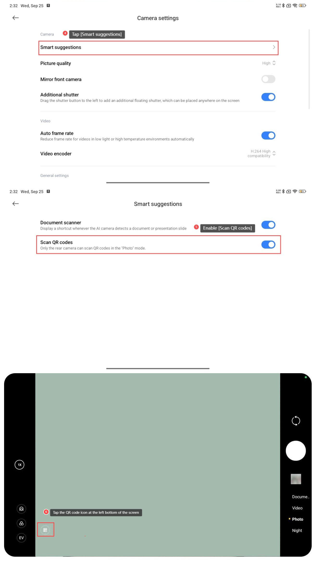 6. Wróć do strony głównej aparatu, zeskanuj kod QR za pomocą aparatu i dotknij ikony kodu QR w lewym dolnym rogu ekranu.