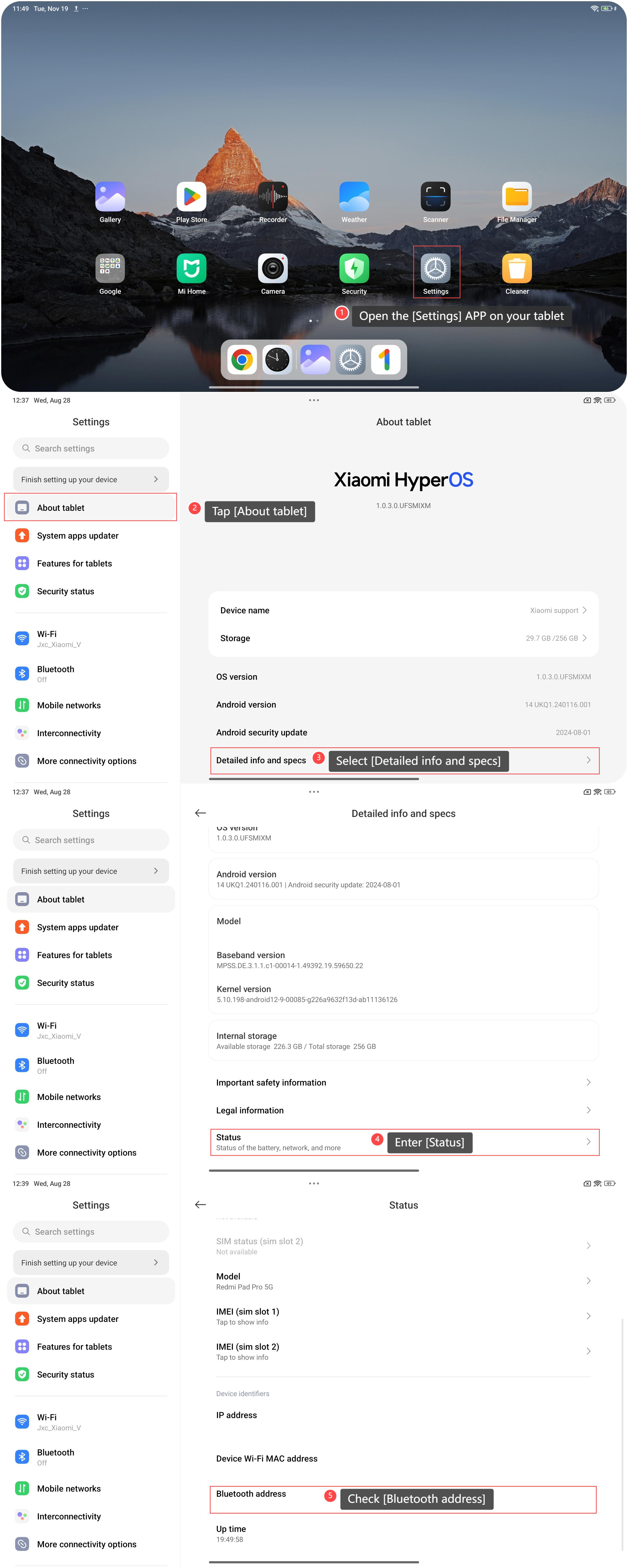Redmi Pad Pro 5G obsługuje sprawdzanie adresu Bluetooth, który jest unikalnym identyfikatorem przypisanym do każdego urządzenia Bluetooth, pomagając odróżnić je od innych urządzeń w pobliżu i jest używany podczas procesu parowania do nawiązania połączenia między urządzeniami.