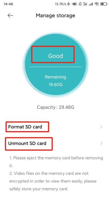 Xiaomi Outdoor Camera AW300 obsługuje zarządzanie pamięcią w aplikacji Mi Home/Xiaomi Home, w tym sprawdzanie stanu karty SD, formatowanie karty SD i odmontowywanie karty SD.