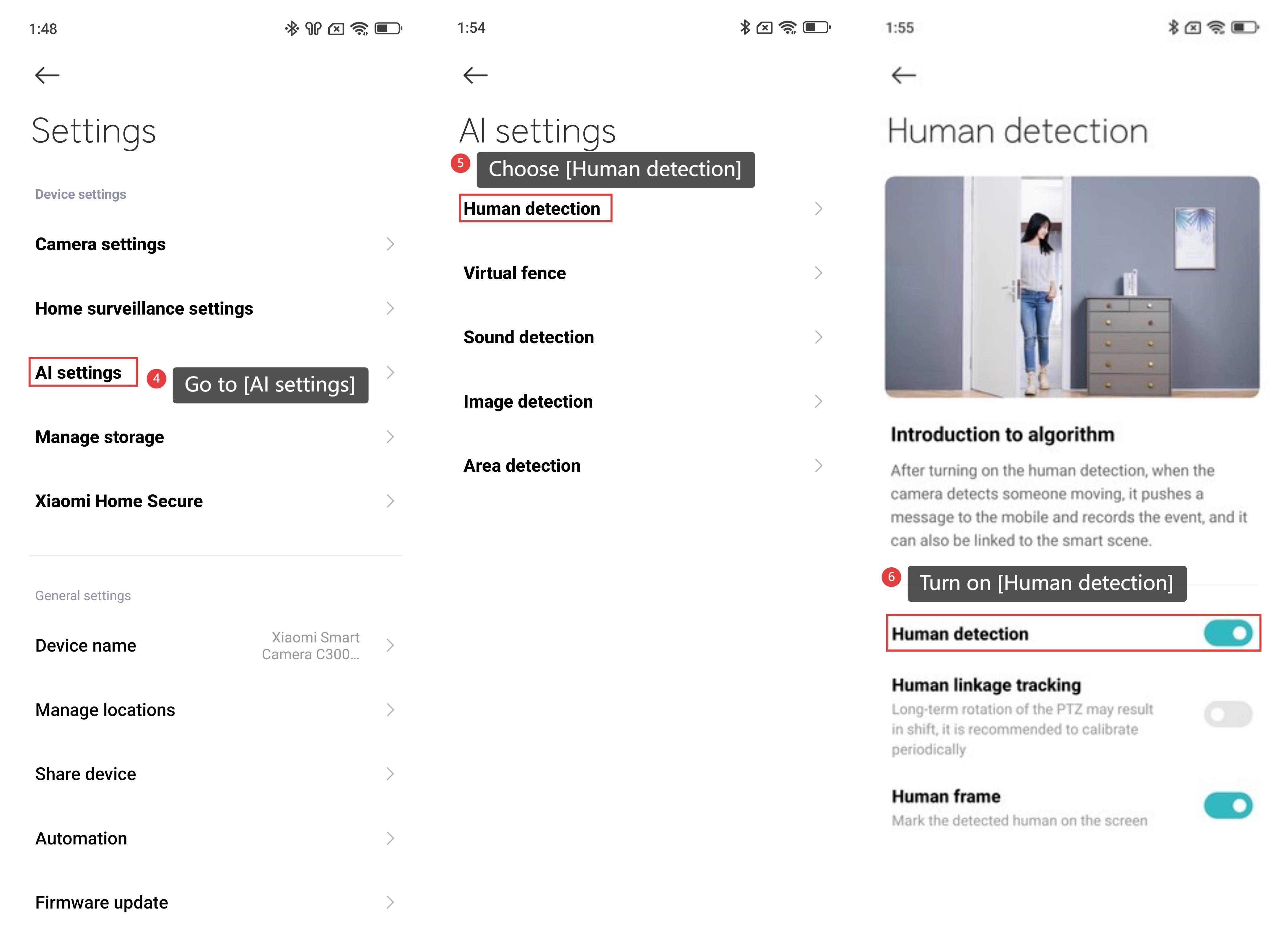 Xiaomi Smart Camera C300 Dual posiada funkcję wykrywania człowieka, która pozwala precyzyjnie identyfikować i reagować na ruchy człowieka. Po włączeniu wykrywania ludzi, gdy kamera wykryje ruch, wysyła wiadomość na telefon i nagrywa zdarzenie, a także może być powiązana ze sceną inteligentną.