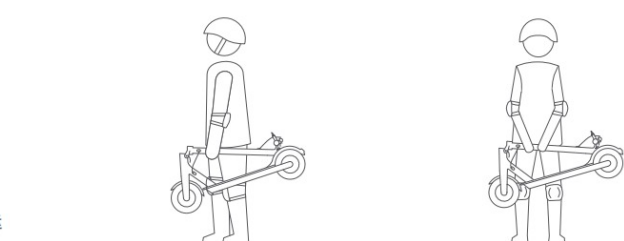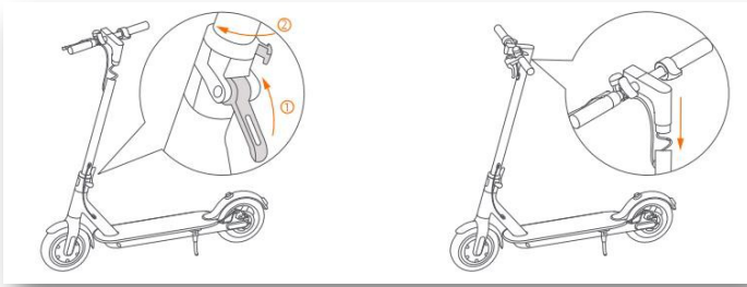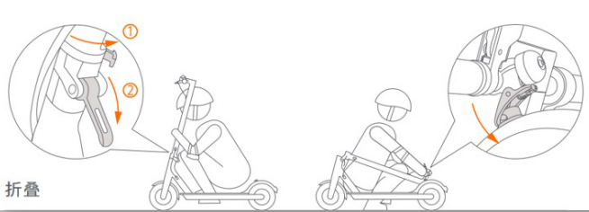 5. В: Как складывать и переносить Mi Electric Scooter 1S? Метод складывания: 1. Перед складыванием выключите электросамокат, поддержите рукой по время процесса и откройте крепление стойки. 2. Закрепите в двух местах. Перенос: для переносадержите стойку одной или двумя руками после складывания.