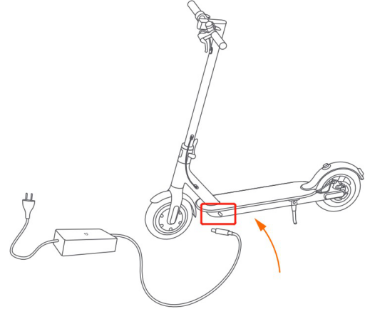 7. В: Как зарядить электрический скутер Mi 1S? О: Зарядный порт находится рядом с передним колесом с левой стороны. Откройте резиновую заглушку и вставьте зарядную вилку. После зарядки закройте резиновую заглушку. Состояние зарядки: когда электрический скутер завершит зарядку, светодиодный индикатор на зарядном устройстве изменится с красного (во время зарядки) на зеленый (после зарядки). Кроме того, задний фонарь будет мигать в состоянии после зарядки, а уровень заряда батареи будет отображаться на панели дисплея после запуска, горизонтальная полоса будет отображать состояние. Расположение порта зарядки следующее: