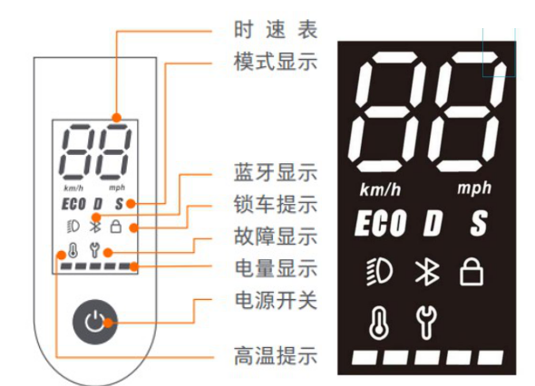 5.В: Каковы функции панели управления Mi Electric Scooter 1S? О: Значки и функции панели управления самокатом следующие: 1. Счетчик скорости: используется для отображения текущей скорости движения электрического скутера; когда электрический скутер выходит из строя, спидометр показывает код неисправности. 2. Дисплей режима: на панели управления есть три индикатора режима езды. Когда электросамокат работает в режиме энергосбережения, индикатор ECO будет гореть долго; Когда электросамокат работает в стандартном режиме, индикатор «D» всегда горит; Когда электросамокат работает в режиме движения, « Индикатор S всегда горит. (Режим энергосбережения: максимальная скорость около 15 км/ч; Стандартный режим: максимальная скорость около 20 км/ч; Спортивный режим: максимальная скорость около 25 км/ч при большой мощности рекомендуется рассмотреть возможность его использования после освоения навыков езды.) 3. Дисплей Bluetooth. Длинный яркий значок Bluetooth указывает на то, что электрический скутер успешно подключен к мобильному устройству. 4. Блокировка: определите, заблокирован лискутерс помощью приложения Mi Home. 5. Отображение неисправности: значок гаечного ключа мигает, указывая на то, что скутер неисправен. 6. Дисплей батареи: отображайте оставшуюся емкость батареи с помощью 5 полос. Каждая полоса представляет около 20 процентов полного заряда батареи. 7. Выключатель питания: короткое нажатие на переключатель, чтобы включить электрический скутер; нажмите и удерживайте переключатель в течение 3 секунд или выше, чтобы выключить электрический скутер; во включенном состоянии коротко нажмите переключатель один раз (чтобы открыть/закрыть дальний свет); непрерывное короткое нажатие переключателя дважды, чтобы переключить режим езды. 8. Высокая температура: когда значок термометра всегда горит, температура батареи составляет не менее 50 ℃. В этом случае способность скутера к ускорению снижается, и его невозможно зарядить.
