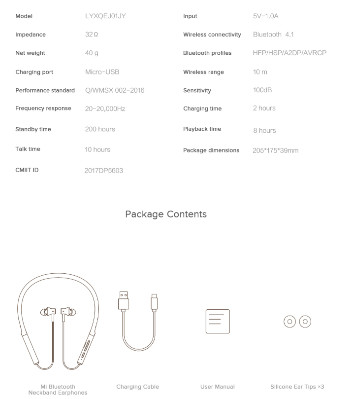 2.Q: Какова длина провода наушников Mi Bluetooth Neckband Earphones? A: Наушники Mi Bluetooth с шейным ободом подключаются через Bluetooth. Покрытие сигнала Bluetooth составляет около 10 метров, а длина от ошейника до гарнитуры — около 22 см. После исследования больших данных наушники Mi Bluetooth с шейным ободком могут удовлетворить потребности большинства людей и не будут ощущаться слишком долго во время использования, что может убедить пользователей в выборе. Общие проблемы 1.Q:Как наушники Mi Bluetooth Neckband Earphones включаются и выключаются? А: Включение: нажмите и удерживайте кнопку питания в течение 3 секунд, и синий индикатор загорится на 1 секунду перед запуском машины. После первого запуска устройство автоматически переходит в состояние ожидания подключения. Выключение: нажмите и удерживайте кнопку питания в течение 3 секунд, и после того, как красный индикатор загорится на 1 секунду, гарнитура выключится. 2.Q:Как заряжаются наушники Mi Bluetooth Neckband Earphones? A: индикатор горит красным во время зарядки и гаснет после завершения зарядки. Если гарнитура заряжается при включении питания, гарнитура перезагрузится и войдет в состояние зарядки. При зарядке вам нужно только подключить стандартный кабель для передачи данных к адаптеру и вставить порт зарядки Micro-USB для зарядки. Не рекомендуется использовать мобильное питание для зарядки гарнитуры. Некоторые мобильные блоки питания имеют ограничения зарядки по малому току, что может привести к сбою зарядки. 3. Q: Поддерживают ли наушники Mi Bluetooth Neckband Earphones зарядку во время использования? A:Учитывая удобство ношения гарнитуры с ошейником и метод зарядки гарнитуры Bluetooth, наушники Mi Bluetooth с шейным ободом не поддерживают зарядку во время использования. 4.Q:Каков срок службы батареи и время зарядки наушников Mi Bluetooth с шейным ободом? A: время работы в режиме ожидания составляет около 200 часов (при прослушивании музыки около 8 часов), а время зарядки составляет около 2 часов. 5. Q: Как проверить заряд батареи наушников Mi Bluetooth Neckband Earphones? A: Когда наушники Mi Bluetooth с шейным ободом включаются, они сообщают об уровне мощности голосом. Когда уровень мощности низкий (примерно через 25-30 минут после выключения гарнитуры), гарнитура также сообщит об уровне мощности. Об этом также можно судить по состоянию индикатора наушников Mi Bluetooth с шейным ободом: когда батарея разряжена , красный светодиодный индикатор мигает два раза в одну секунду и циклически повторяется один раз в пять секунд. Кроме того, когда наушники Mi Bluetooth с шейным ободом подключены к мобильному телефону IOS или Xiaomi, батарея будет отображаться в строке состояния. Некоторые телефоны Android не могут отображать заряд батареи, что является нормальным явлением, а не проблемой качества продукта). 6.Q:Как подключить наушники Mi Bluetooth Neckband Earphones? A: в выключенном состоянии нажмите и удерживайте кнопку в течение 3 секунд, синий индикатор начнет мигать, наушники перейдут в состояние ожидания подключения, включите Bluetooth, выполните поиск и подключение (если необходимо ввести пароль, введите пароль 0000), после успешного сопряжения индикатор гарнитуры загорится синим светом, это означает, что соединение установлено. Автоматическое подключение: наушники Mi Bluetooth с шейным ободом автоматически подключатся к подключенному Bluetooth-устройству после включения. Когда запись не обнаружена или какое-либо устройство Bluetooth не може
