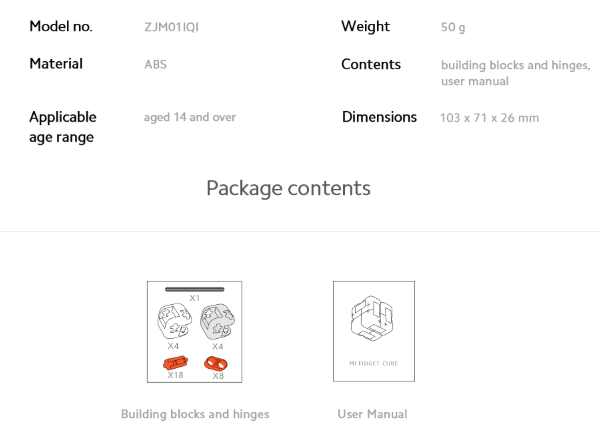 Вид 1. Q: Какова форма блоков, когда они закончены? A: После завершения строительства в соответствии с учебным пособием, приведенным в руководстве по строительству, оно похоже на кольцо из блоков. Длина, ширина и высота составляют 64 мм, 32 мм и 16 мм соответственно. 2.В: Из какого материала сделан Mi Fidget Cube? О: Mi Fidget Cube изготовлен из высококачественного АБС-пластика. Материал обладает хорошей ударопрочностью, термостойкостью, устойчивостью к низким температурам, химической стойкостью и электрической стойкостью, а также другими характеристиками, в то же время обеспечивая безопасность и нетоксичность, можно быть уверенным в использовании. 3.Q: Как собрать Mi Fidget Cube? A: В соответствии с инструкциями по сборке в упаковке, просто следуйте схеме для сборки. Количество блоков: Инструмент для разборки: