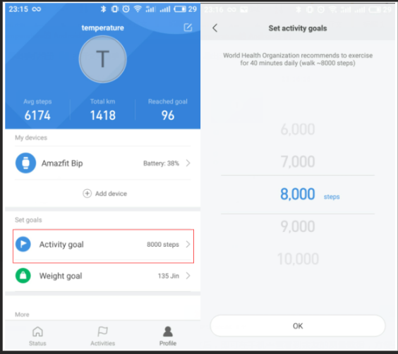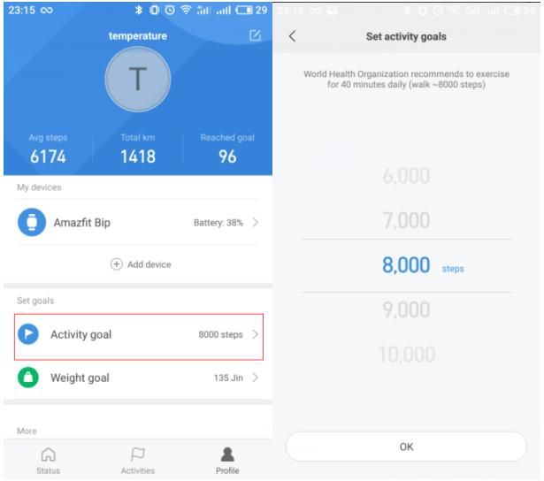 1) افتح تطبيق Mi Fit واضغط على "الملف الشخصي" في الزاوية اليمنى السفلى. 2) اضغط على "هدف النشاط" للإعداد. 3) لتعيين هدف الخطوة ، قم بالتمرير لأعلى أو لأسفل للعثور على عدد الخطوات المطلوبة وانقر فوق "موافق" للحفظ. 4) لتمكين إشعارات الأهداف ، افتح تطبيق Mi Fit واضغط على الملف الشخصي في الزاوية اليمنى السفلى ، وانقر فوق أجهزتي --- Amazfit Bip ، وانقر فوق المزيد ، واضغط على إشعارات الهدف ، وقم بالتبديل أو إيقاف التشغيل لتمكين إشعارات الهدف أو تعطيلها.