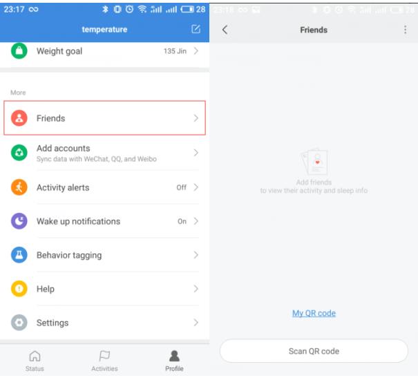 من خلال إضافة الأصدقاء والعائلة في تطبيق Mi Fit ، يمكنك عرض نشاطهم وبياناتهم الصحية. لإضافة الأصدقاء والعائلة، افتح Mi Fit APP➡Profile➡Friends➡Scan رمز الاستجابة السريعة أو اضغط على أيقونة النقاط الثلاث العمودية في الزاوية العلوية اليمنى لإضافتها بواسطة معرفاتهم.