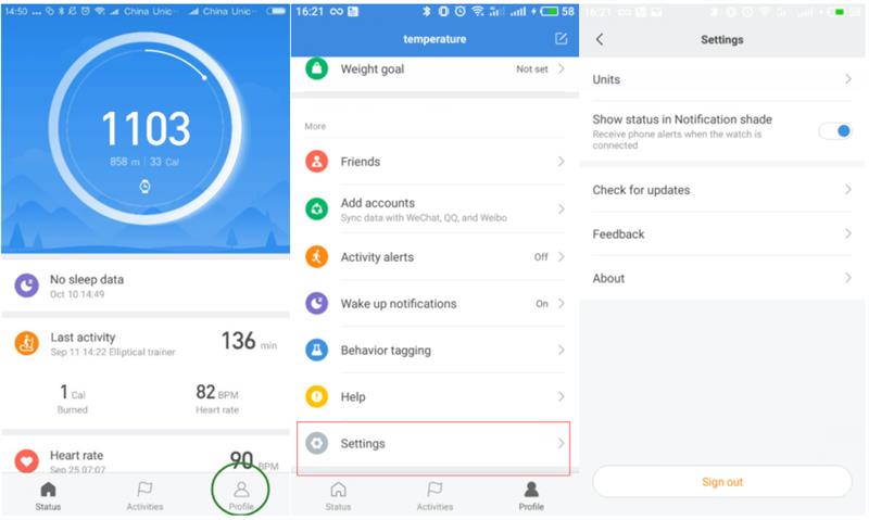 افتح Mi Fit APP ، وانقر فوق الملف الشخصي في الزاوية السفلية اليمنى ، ويمكنك الوصول إلى "التعليقات" و "التحقق من وجود تحديث" و "حول". اضغط على "ملاحظات" لكتابة وإرسال تعليقاتك وملاحظاتك حول المنتج. اضغط على "التحقق من وجود تحديث" للتحقق من الإصدار الجديد من التطبيق والتحديث. اضغط على "حول" للتحقق من الإصدار الحالي من Mi Fit APP.