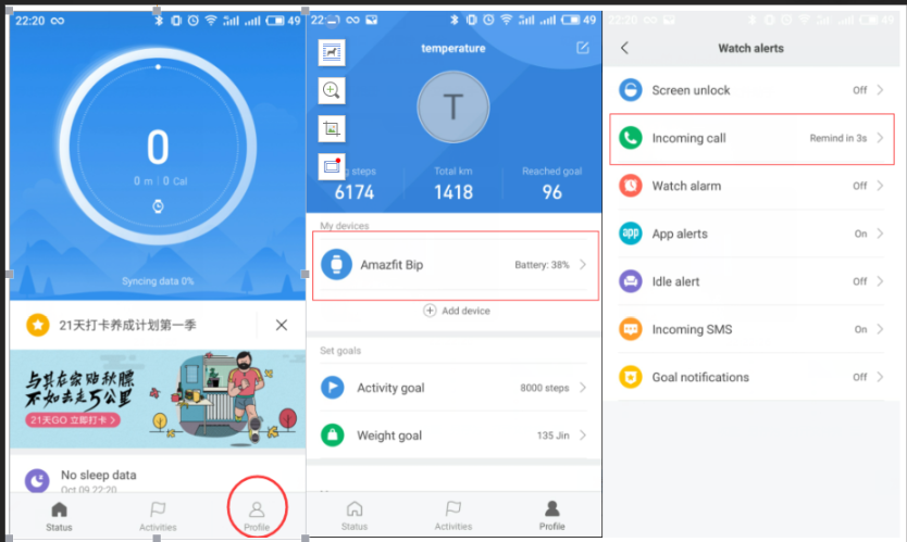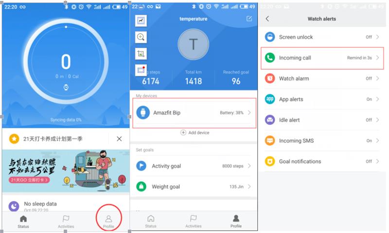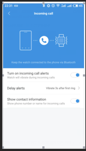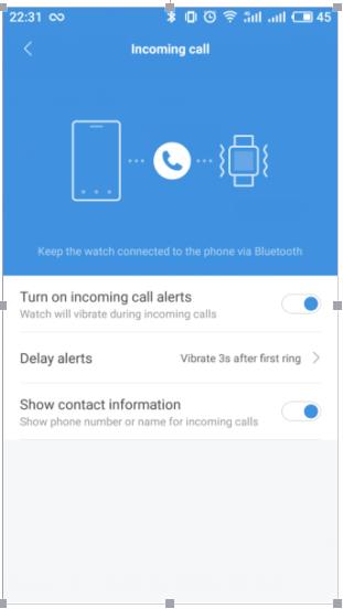 18. كيفية إعداد تنبيهات المكالمات الواردة؟ 1) افتح تطبيق Mi Fit 2) اضغط على "الملف الشخصي" في الزاوية اليمنى السفلى. 3) اضغط على أجهزتي - Amazfit Bip 4) اضغط على مكالمة واردة 5) التبديل على تنبيهات المكالمات الواردة 6) قم بإعداد تنبيهات التأخير إذا لزم الأمر. 7) قم بالتبديل بين "إظهار معلومات الاتصال" لإظهار رقم الهاتف أو جهات الاتصال للمكالمات الواردة.