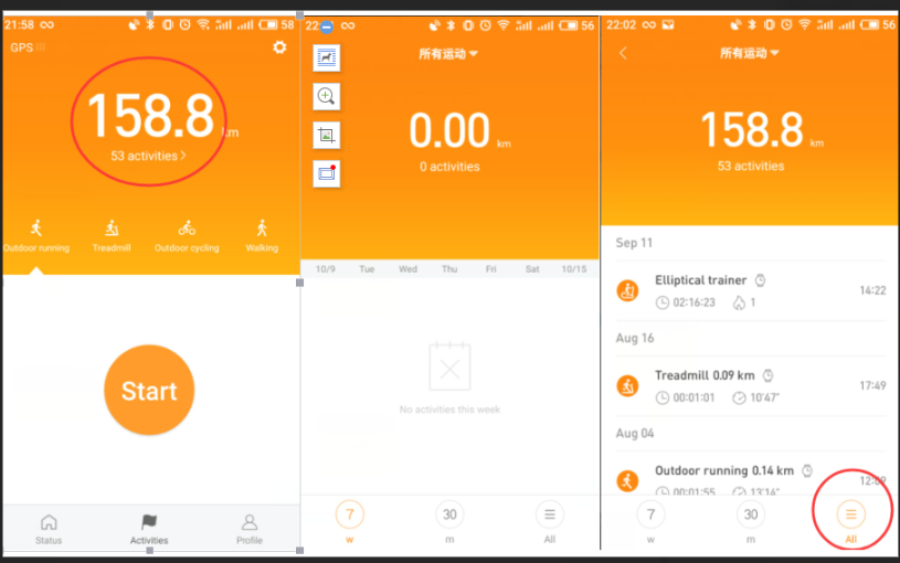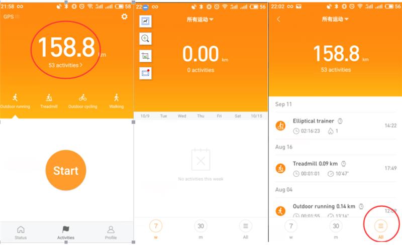 افتح Mi Fit APP ، وانقر فوق "الأنشطة" في أسفل منتصف الشاشة للوصول إلى إجمالي الأميال والتدريبات. اضغط على إجمالي عدد الأميال، يمكنك عرض سجلك الرياضي حسب الأسبوع أو الشهر أو عرض الكل.