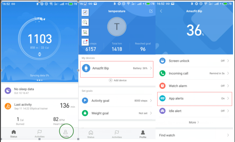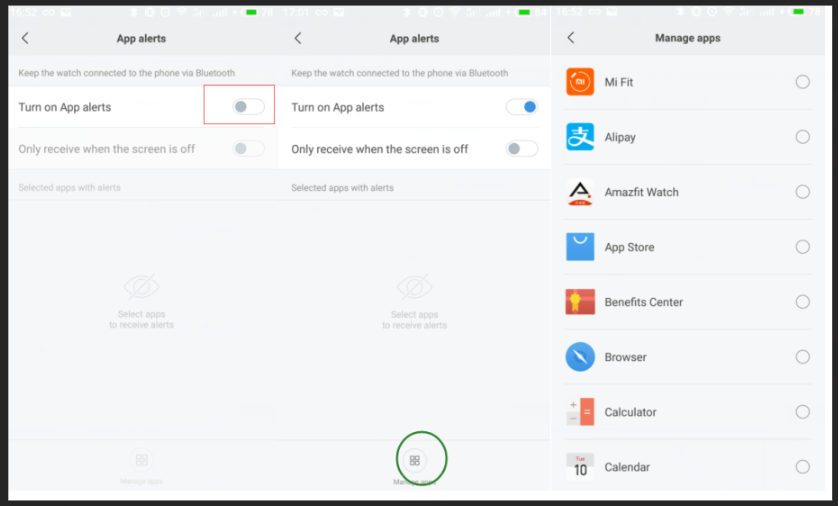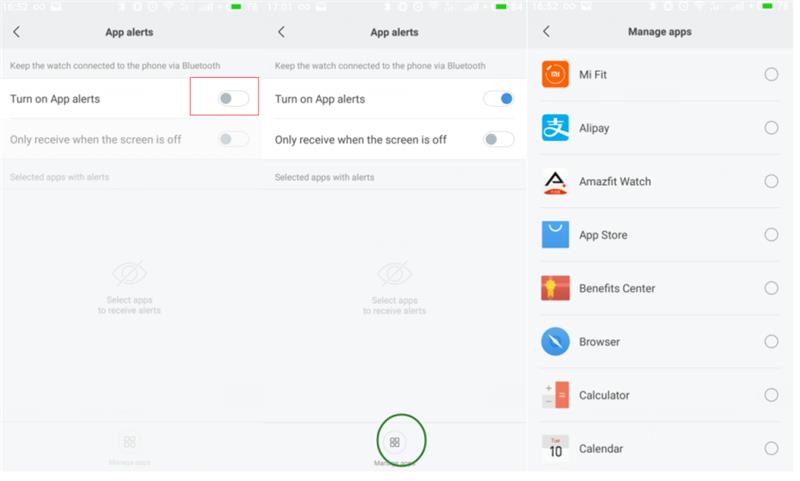 1) افتح تطبيق Mi Fit واضغط على"الملف الشخصي" في الزاوية اليمنى السفلى. 2) اضغط على أجهزتي - Amazfit Bip 3) اضغط على تنبيهات التطبيق للسماح ل Mi Fit بالوصول إلى الإشعارات 4) قم بتشغيل تنبيهات التطبيق 5) اضغط على "إدارة التطبيقات" في أسفل منتصف الشاشة وحدد التطبيق للتنبيه.