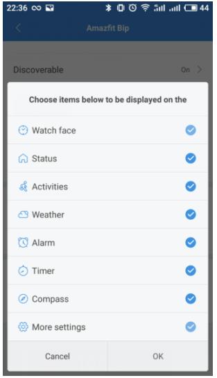 1. افتح تطبيق Mi Fit 2. اضغط على "الملف الشخصي" في الزاوية اليمنى السفلى. 3. اضغط على أجهزتي - Amazfit Bip ، اسحب لأعلى حتى تجد "إعدادات عرض الساعة" 4. يمكنك اختيار عناصر مثل الحالة والأنشطة والطقس والتنبيه والمؤقت والبوصلة ليتم عرضها على الساعة أم لا. يرجى ملاحظة أن واجهة الساعة والمزيد من الإعدادات يتم عرضها افتراضيا على الساعة.