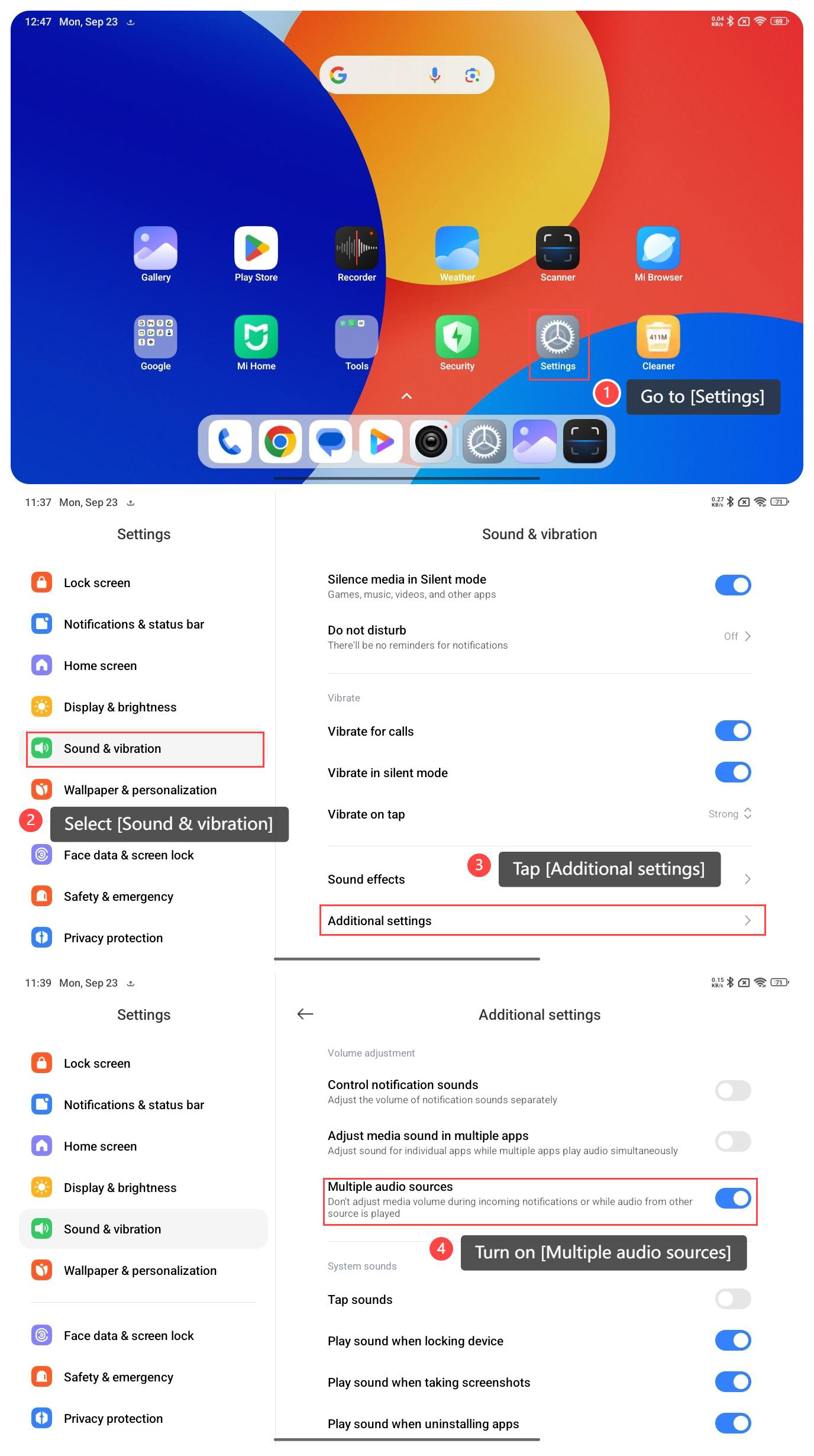تسمح ميزة مصادر الصوت المتعددة المدمجة في Redmi Pad SE 8.7 4G للجهاز بعدم ضبط مستوى صوت الوسائط أثناء الإشعارات الواردة أو أثناء تشغيل الصوت من مصادر أخرى. وهذا يعني أن بعض التطبيقات، خاصة تلك المتعلقة بتشغيل الوسائط (على سبيل المثال، مشغلات الموسيقى أو مشغلات الفيديو أو تطبيقات البث أو المكالمات الواردة أو إشعارات الرسائل)، يمكنها الاستمرار في تشغيل الصوت في الخلفية أثناء استخدام تطبيقات أخرى أو تنفيذ مهام أخرى على جهازك اللوحي. بعد تمكين هذه الميزة ، ستستمتع بالراحة وستحصل على تجربة تأثير صوتي محسنة.