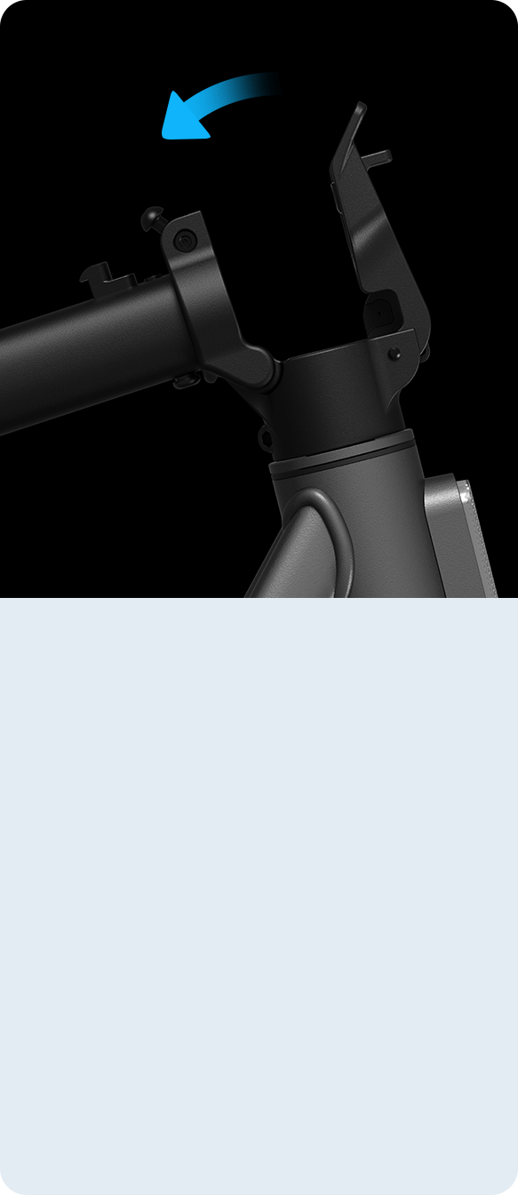 ตรวจสอบให้แน่ใจว่าสกู๊ตเตอร์ปิดเครื่องและไม่ได้ชาร์จอยู่ก่อนทำการพับ จับแฮนด์ชูคันล็อกควิกรีลีส แล้วดึงคันล็อกควิกรีลีสออกด้านนอก