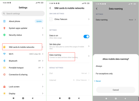 วิธีการตั้งค่าเฉพาะ: การตั้งค่า>> ซิมการ์ดและเครือข่ายมือถือ>>การโรมมิ่งข้อมูล