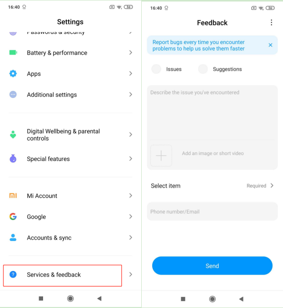 วิธีการตั้งค่าเฉพาะ: การตั้งค่า>>บริการและคําติชม ให้แสดงความคิดเห็น