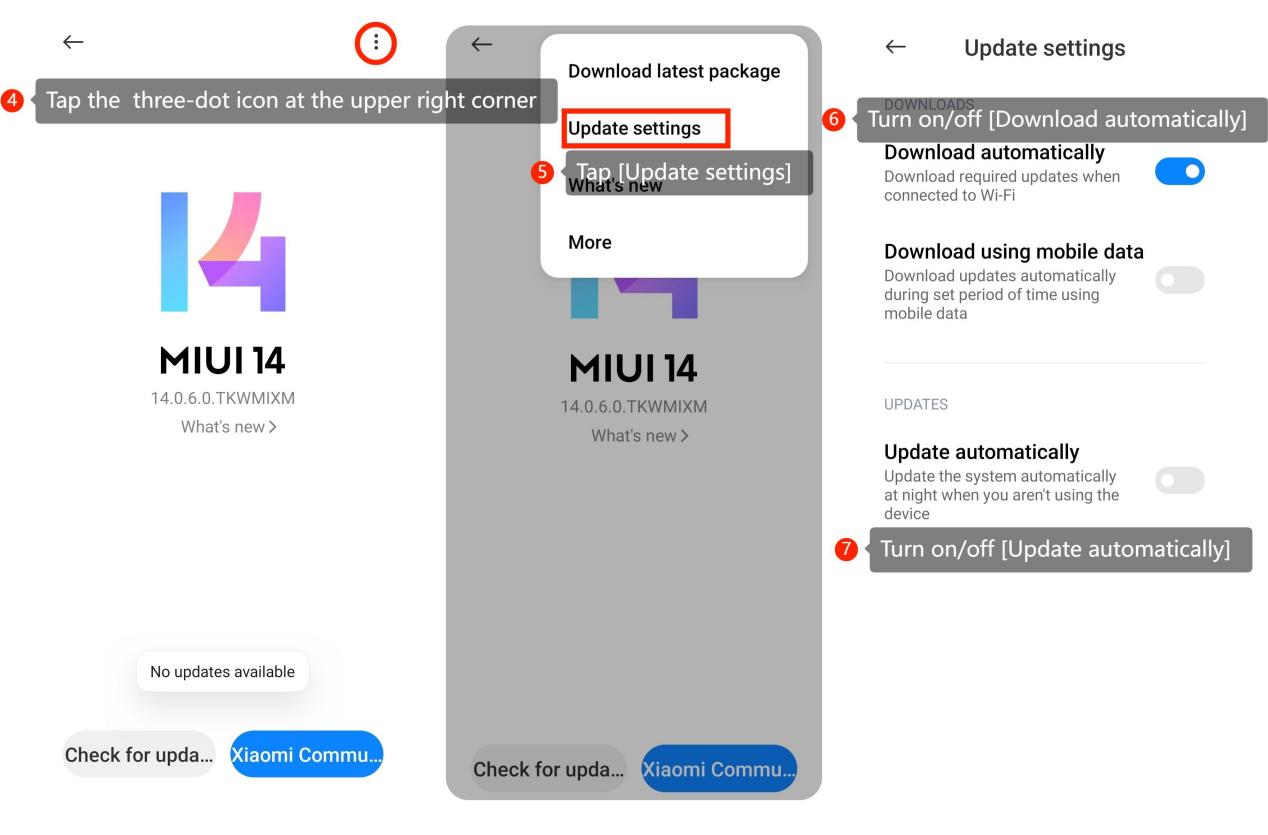 2. ไปที่ [เกี่ยวกับโทรศัพท์] >>แตะ [เวอร์ชัน MIUI] >>แตะไอคอนสามจุดที่มุมขวาบน>> [อัปเดตการตั้งค่า] >>เปิด/ปิด [ดาวน์โหลดโดยอัตโนมัติ] >>เปิด/ปิด [อัปเดตโดยอัตโนมัติ]