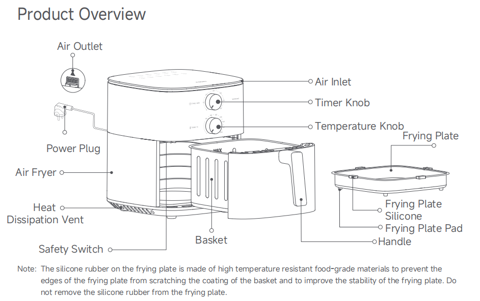 Xiaomi Air Fryer Essential 6L ประกอบด้วยช่องระบายอากาศ/ปลั๊กไฟ/ช่องระบายอากาศ/ช่องระบายความร้อน/สวิตช์นิรภัย/ช่องลมเข้า/ปุ่มตั้งเวลา/ปุ่มปรับอุณหภูมิ / ตะกร้า/จานทอด/แผ่นซิลิโคน/แผ่นทอด/ที่จับ