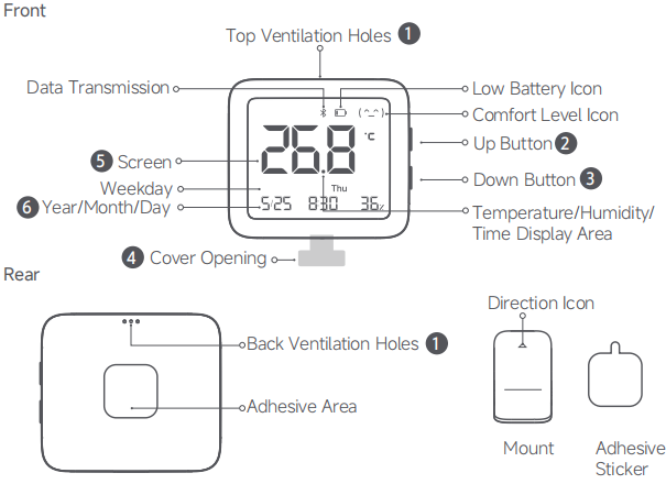 มีรูระบายอากาศด้านบน, ไอคอนแบตเตอรี่ต่ํา, ไอคอนระดับความสะดวกสบาย, ปุ่มขึ้น, ปุ่มลง, พื้นที่แสดงอุณหภูมิ/ความชื้น/เวลา, การส่งข้อมูล, หน้าจอ, วันธรรมดา/ปี/เดือน/วัน และฝาปิดที่ด้านหน้า มีรูระบายอากาศด้านหลัง พื้นที่กาว ไอคอนทิศทาง ตัวยึด และสติกเกอร์กาวที่ด้านหลัง