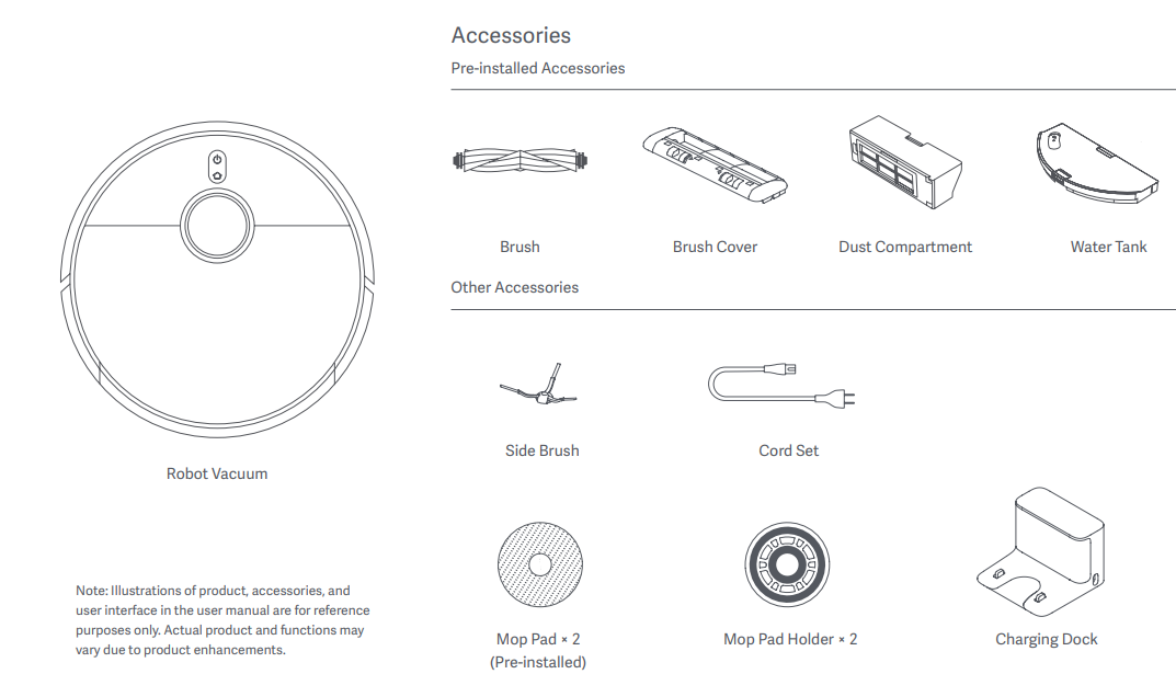 ตอบ: Xiaomi Robot Vacuum S20+ ประกอบด้วยยูนิตหลักและแท่นชาร์จ อุปกรณ์เสริมที่ติดตั้งบนตัวเครื่องหลัก ได้แก่ แปรง ฝาครอบแปรง ช่องเก็บฝุ่น และธนาคารน้ํา อุปกรณ์เสริมอื่นๆ ได้แก่ แปรงด้านข้าง ชุดสายไฟ ที่ยึดแผ่นม็อบ ×2 และแผ่นม็อบ × 2 (ติดตั้งไว้ล่วงหน้า)