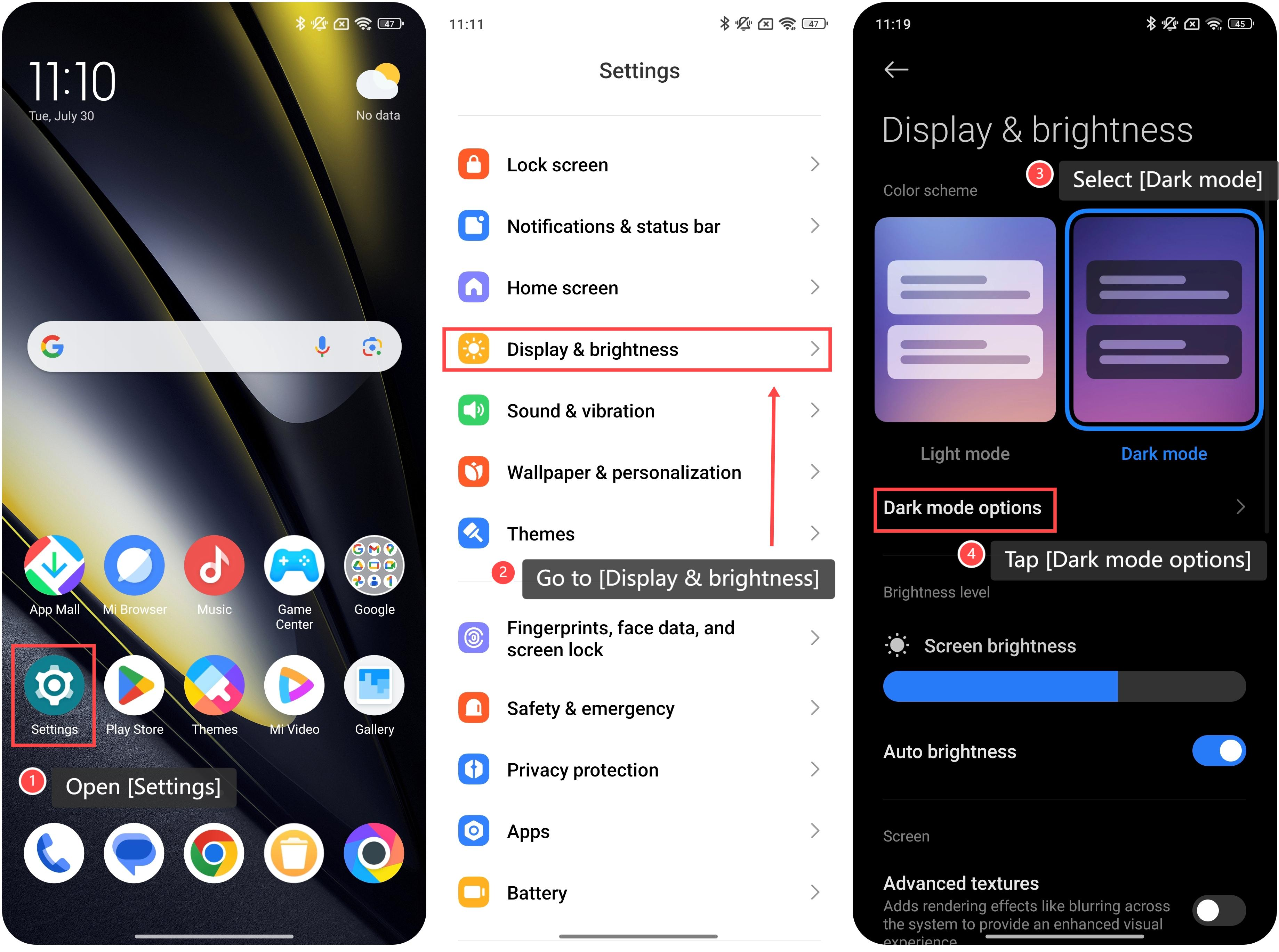 4. โทรศัพท์ของคุณยังมี [ตัวเลือกโหมดมืด] เพื่อให้คุณปรับการตั้งค่าเหล่านี้เพิ่มเติมตามความต้องการของคุณ แตะเพื่อป้อน
