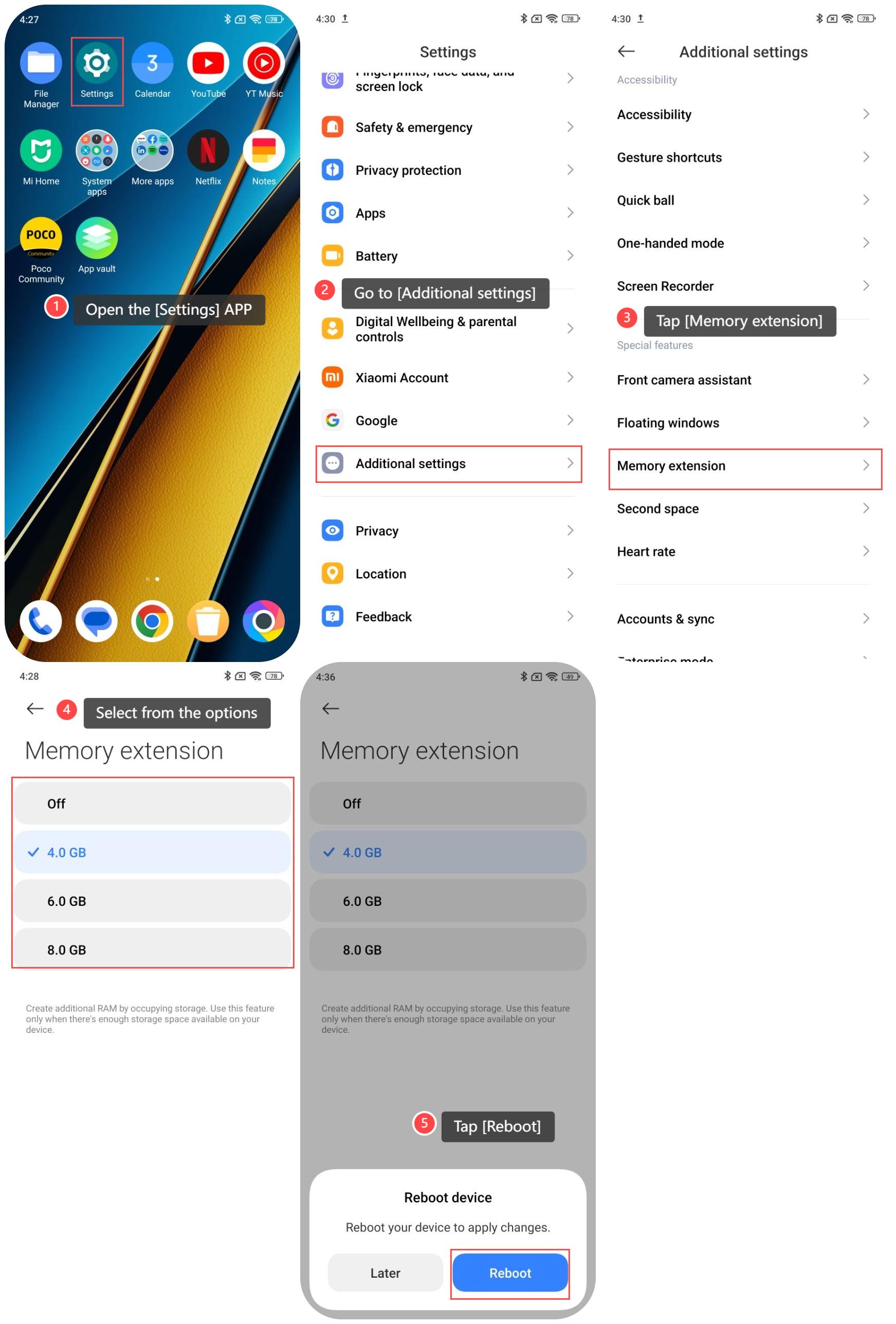 ในการตั้งค่าส่วนขยายหน่วยความจําบน POCO F6 Pro โปรดดูวิธีการต่อไปนี้:
