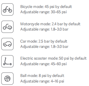 13.Q: ทําไม Xiaomi Portable Electric Air Compressor 2 จึงไม่สามารถตั้งค่าล่วงหน้าเป็น 120psi เมื่อพองรถจักรยานยนต์ได้? ตอบ: ด้วยเหตุผลด้านความปลอดภัยจําเป็นต้องตั้งค่าเงินเฟ้อแรงดันสูงในโหมดแมนนวลและในโหมดจักรยานสามารถปรับความดันได้ระหว่าง 30-65psi เท่านั้น โหมดแมนนวลคือที่ที่คุณกดปุ่มสวิตช์โหมดจนกว่า tจะไม่มีไอคอนโหมดทางด้านซ้ายของจอแสดงผล