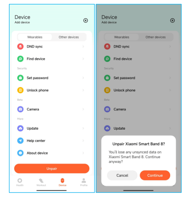 ยกเลิกการจับคู่วิธีการ: วิธีที่ 1: ยกเลิกการจับคู่จากรายการการจัดการอุปกรณ์: เมื่อวงดนตรี เชื่อมต่อกับโทรศัพท์มือถือให้เปิดแอพ Mi Fitness - >อุปกรณ์ - >ดูอุปกรณ์ทั้งหมด - > กดอุปกรณ์ปัจจุบันค้างไว้ - >ยกเลิกการจับคู่คลิก "ยกเลิกการจับคู่" เพื่อเลิกจับคู่วงดนตรีจะถูกกู้คืนเป็นการตั้งค่าจากโรงงานหลังจากยกเลิกการจับคู่ วิธีที่ 2: ยกเลิกการจับคู่อุปกรณ์ปัจจุบัน: เมื่อวงดนตรีเชื่อมต่อกับโทรศัพท์มือถือให้เปิดแอพ Mi Fitness - >อุปกรณ์ - >เลื่อนไปที่ด้านล่าง - >ยกเลิกการจับคู่คลิก "ยกเลิกการจับคู่" ถึง Unbound และวงดนตรีจะถูกยกเลิกการผูกหลังจากยกเลิกการจับคู่ เรียกคืนโรงงาน