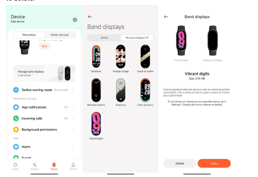 แอพ: Device->Band Face Market->My band face->คลิกที่ band face->คลิกเพื่อลบ