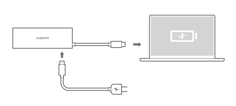1. เชื่อมต่อขั้วต่อ Type-C ของอะแดปเตอร์แปลงไฟเข้ากับฮับตามที่แสดงด้านล่างเพื่อชาร์จแล็ปท็อป