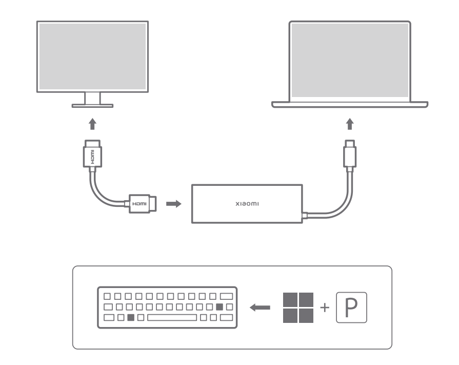 4. ฉายหน้าจอแล็ปท็อปของคุณไปยังอุปกรณ์แสดงผลภายนอก เชื่อมต่ออุปกรณ์แสดงผลภายนอกเข้ากับฮับผ่านสาย HDMI ดังที่แสดงด้านล่าง กดปุ่ม Windows และ P บนแป้นพิมพ์พร้อมกัน และเลือกโหมดการฉายภาพ Windows เพื่อเริ่มการฉายภาพ
