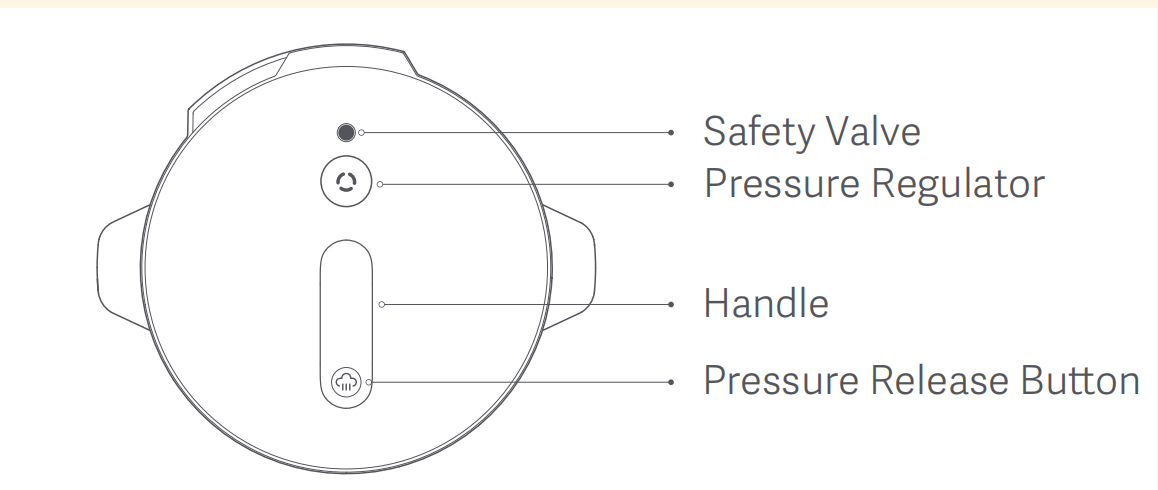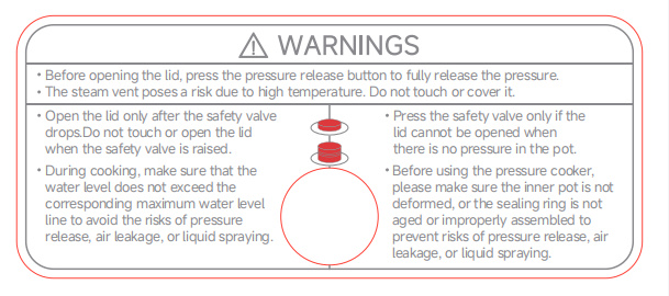 เมื่อใช้งานปุ่มปล่อยแรงดัน ให้กดจากด้านหน้าของหม้ออัดแรงดันโดยรักษาระยะห่างที่ปลอดภัยจากตัวควบคุมแรงดันเพื่อป้องกันไอน้ําลวก เมื่อปรุงอาหารเหลว (เช่น น้ําซุป โจ๊ก ฯลฯ) อย่าใช้ปุ่มปล่อยแรงดันเพื่อปล่อยแรงดันเพื่อป้องกันน้ําร้อนลวกที่อาจเกิดขึ้นจากการล้นของอาหาร รอให้วาล์วนิรภัยหล่นลงก่อนเปิดฝา