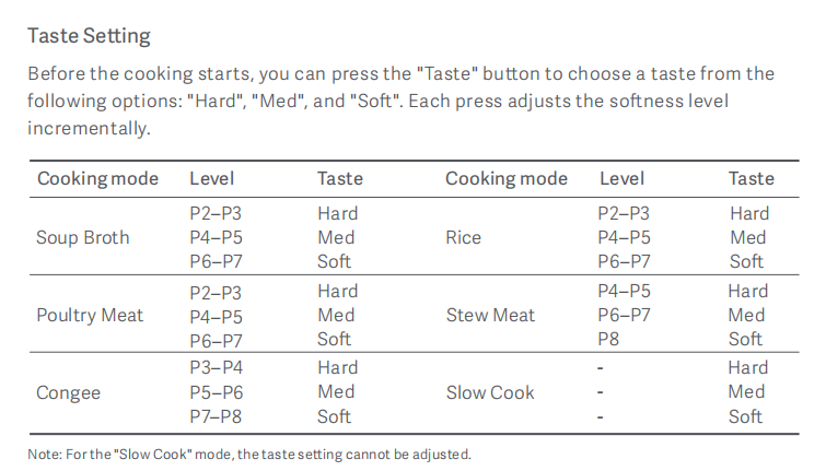 ตอบ: ก่อนที่คุณจะเริ่มทําอาหาร คุณสามารถกดปุ่ม "รสชาติ" เพื่อเลือกรสชาติ ทุกครั้งที่คุณกด ระดับความดันจะค่อยๆ เพิ่มขึ้น ซึ่งสอดคล้องกับรสชาติสามระดับ: Hard, Med และ Soft