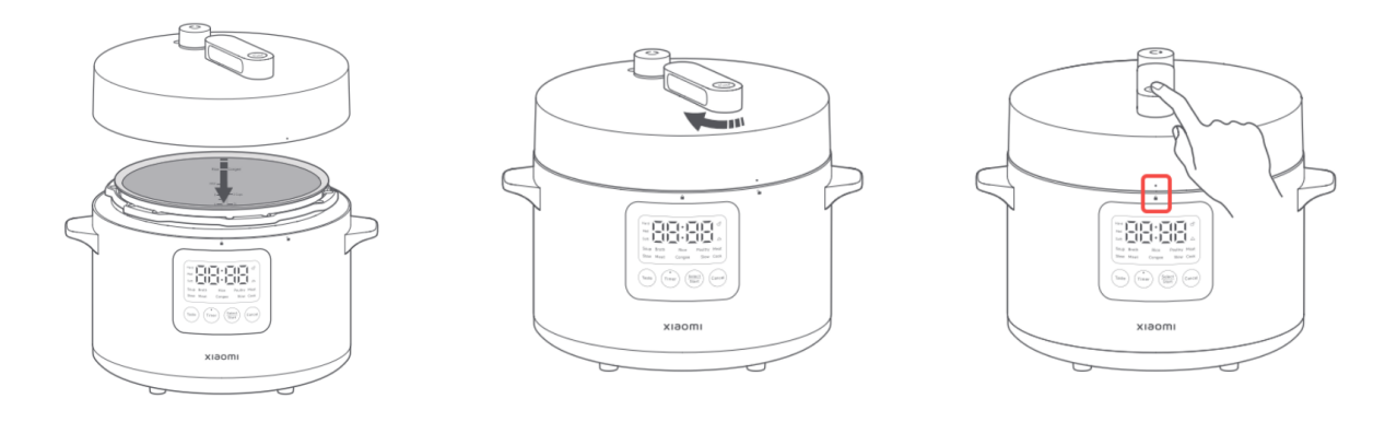 จัดที่จับให้ตรงกับตัวล็อคและปิดฝาหม้ออัดแรงดัน จากนั้นจับที่จับแล้วหมุนฝาตามเข็มนาฬิกาจนกระทั่งจุดอยู่ในแนวเดียวกับตัวล็อค แสดงว่าฝาปิดสนิทแล้ว