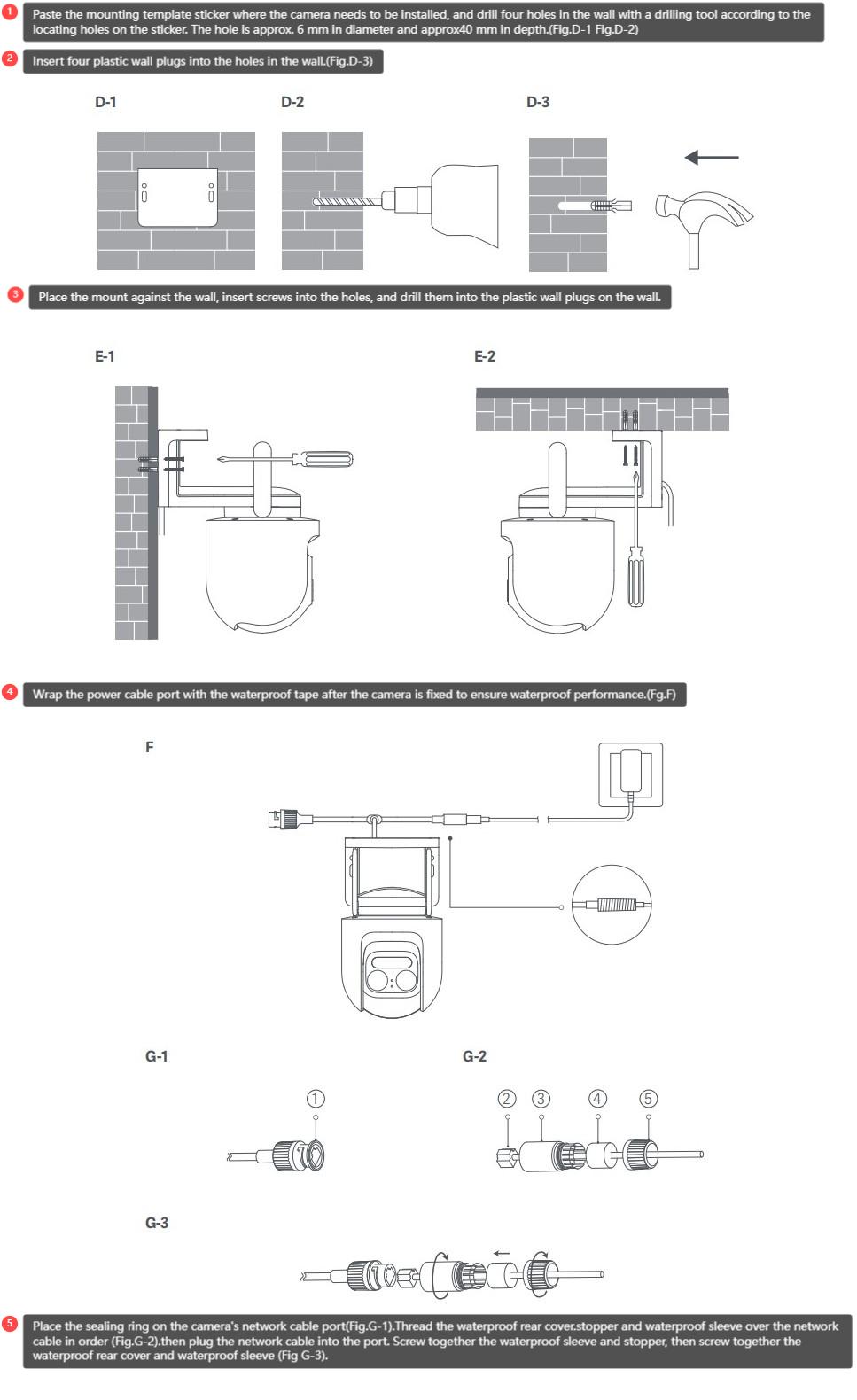 4. พันพอร์ตสายไฟด้วยเทปกันน้ําหลังจากยึดกล้องแล้วเพื่อให้มั่นใจถึงประสิทธิภาพการกันน้ํา (รูปที่ F);